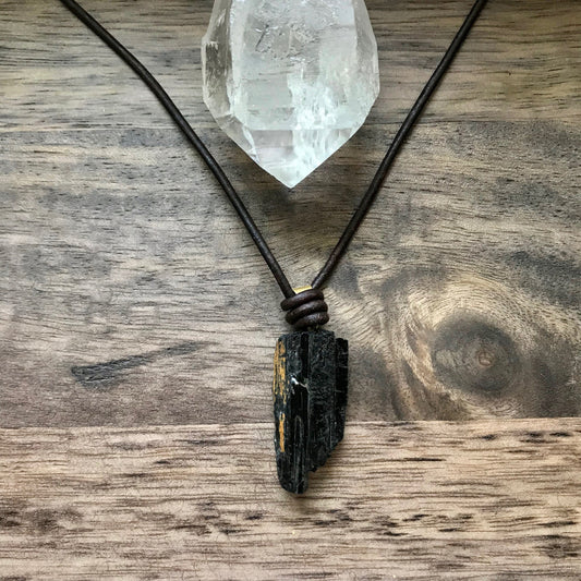 Men’s Black Leather Necklace with Rustic Black Tourmaline Pendant – Natural Raw Stone Jewelry – Grounding Crystal Necklace