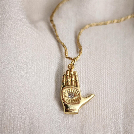 14k Gold Fill Open Hand Hamsa Necklace – All-Seeing Eye Pendant, Spiritual Protection Jewelry