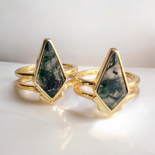 14k Gold Moss Agate Ring - Kite Shape Gemstone Ring, Double Band Gold Ring