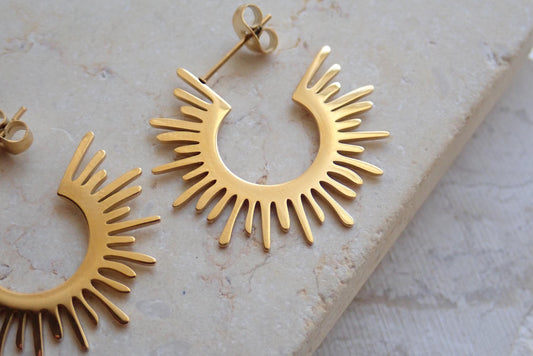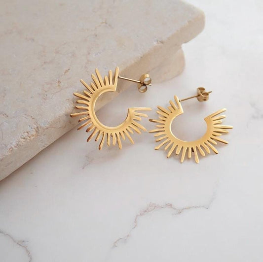 18K Gold Sunburst Hoop Earrings • Waterproof Lightweight Hoops • Gold Filled Stainless Steel Earrings, Medium Spiked Hoops,Minimalist Hoops