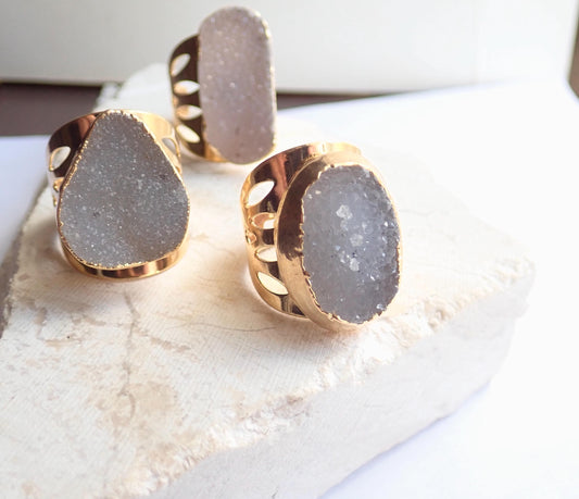 Adjustable Druzy Statement Ring, Agate Cocktail Ring, Large Stone Ring, Natural Gemstone Cocktail Ring,Big Chunky Neutral Gemstone Ring Gold
