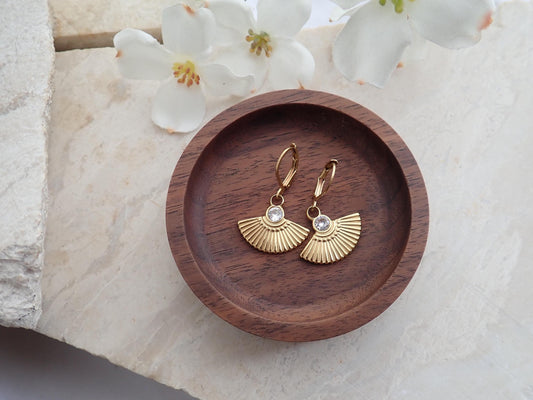 Gold Fan Charm Hoops Earrings- CZ Crystal WATERPROOF Dangle Hoops -Non Tarnish Jewelry, PVD Stainless Steel