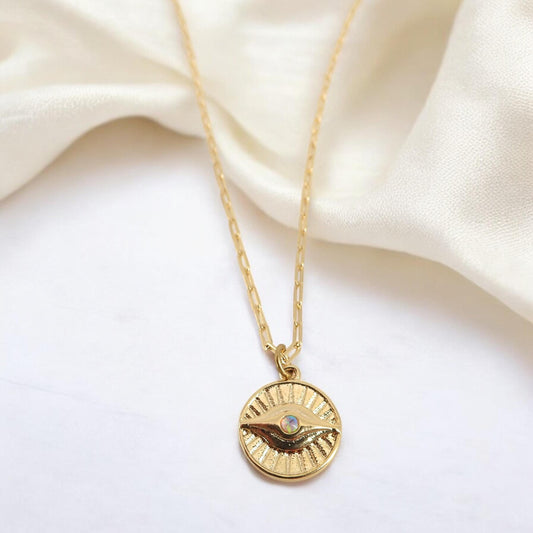 Gold Evil Eye Necklace – Sunburst Opal Charm, Dainty Medallion Necklace, October Birthstone, Celestial Protection Jewelry, Gold Fill Chain