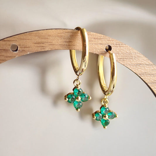 Gold Hoop Earrings with Green Crystal Flower Charms | Dainty Emerald Clover Hoops | Small Gold Dangle Hoops, Gemstone Jewelry Gift for Her
