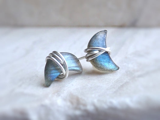 Labradorite Gemstone Stud Earrings, Crescent Moon Earrings, Wire Wrap Crystal Studs,Celestial Jewelry,Half Moon Earrings,Labradorite Jewelry