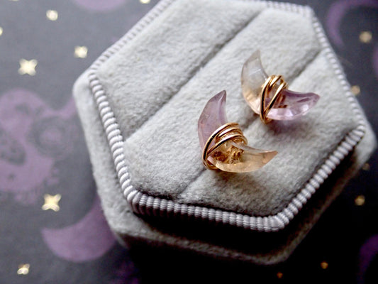 Ametrine Stud Earrings, Ametrine Jewelry, Crescent Moon Earrings,Wire Wrapped Gemstone, Celestial Jewelry,Crystal Posts,Minimal Gift for Her