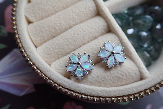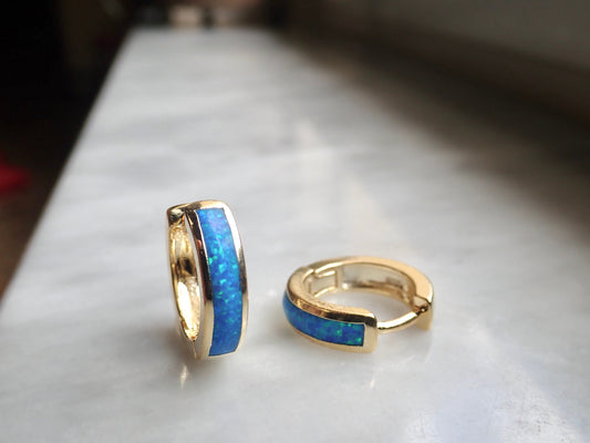 Opal Inlay Huggie Hoops - Blue or White Opal Earrings - Gold Gemstone Hoops