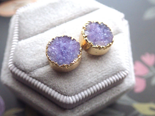Purple Druzy Crystal Studs – Round Cut with 14k Gold Plating