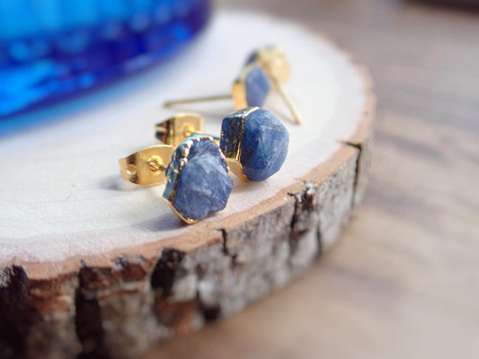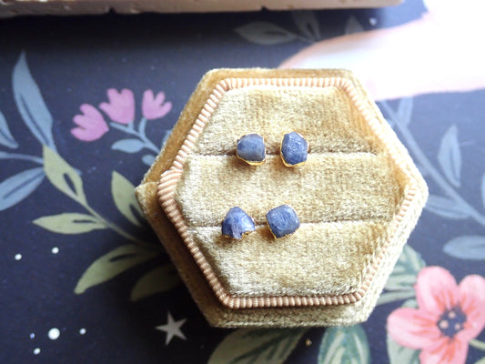 Raw Sapphire Stud Earrings | 24K Gold Vermeil Handmade Bezel | Hypoallergenic Natural Gemstone Jewelry