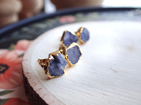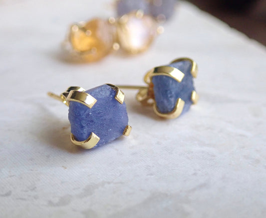 Raw Tanzanite Stud Earrings – Gold Plated Prong Setting | December Birthstone Gemstone Jewelry