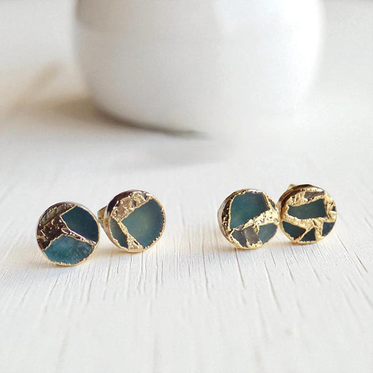 Seafoam Teal Round Stud Earrings Gold Veins – Kintsugi Inspired Jewelry, Minimalist Gemstone Earrings,Round Stone Post Earrings,Gift for Her