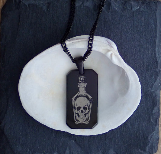 Tell No Tales Necklace - Men's Dog Tag Necklace - Black - Rum Bottle with Skull Pirate Jewelry