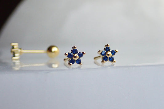 Blue CZ Flower Stud Earrings • Sterling Silver with 14K Gold Plating • Small Screw Back Earrings • Dainty Floral Studs for Second Hole