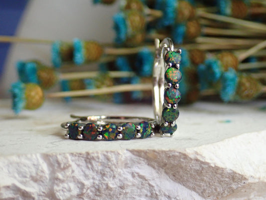 Black Opal Hoop Earrings • Silver Plated Medium Hoops with Prong Set Opals • Dainty Statement Earrings • October Birthstone Gift