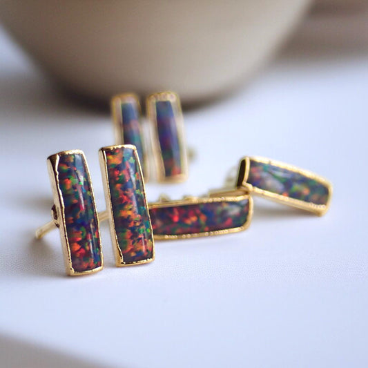 Black Opal Stud Earrings | 14k Gold Opal Bar Earrings | October Birthstone Jewelry, Gift for Her, Opal Post Earrings, Dainty Opal Studs