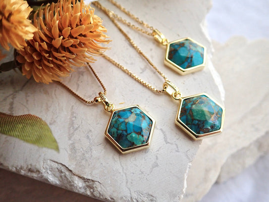 Turquoise Pendant Necklace -14k Gold Vermeil Turquoise Necklace, Hexagon Gemstone Necklace,December Birthstone