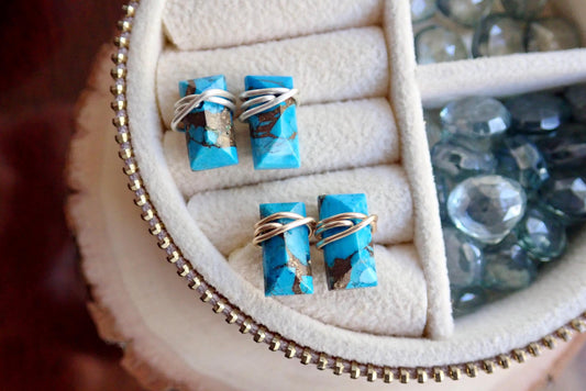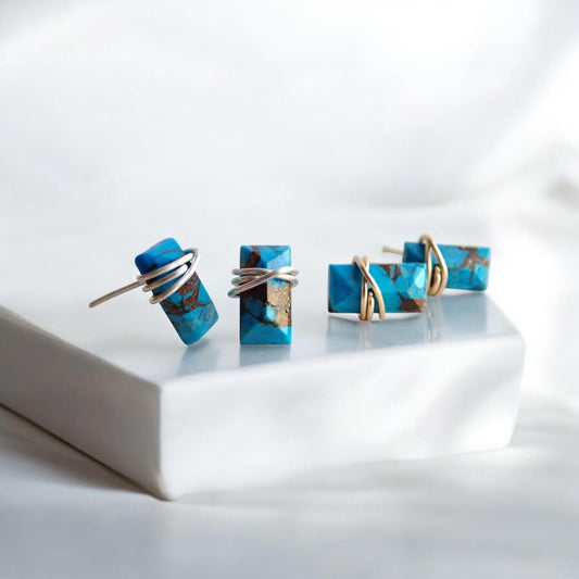Turquoise Stud Earrings Gold Sterling Silver, Rectangle Stone Posts, Copper Turquoise Bar Earrings,Wire Wrap Stud Earrings,Turquoise Jewelry