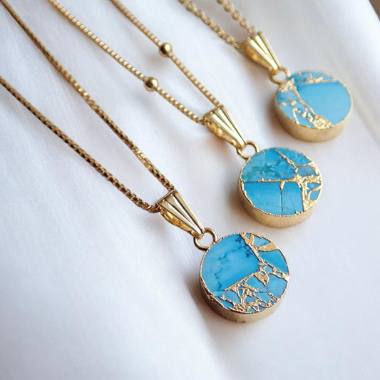 Turquoise Pendant Necklace Gold, Gemstone Coin Pendant, Mojave Turquoise Necklace,December Birthstone Gift for Her,Dainty Minimalist Jewelry