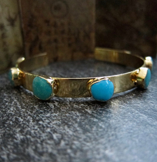 Turquoise and Gold Cuff Bracelet – 14k Gold Plated Open Cuff with Six Genuine Turquoise Stones