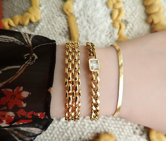 Waterproof Gold Filled Stacking Bracelets - Thick Chain Bracelet - Herringbone Bracelet- Curby Chain Crystal Bracelet