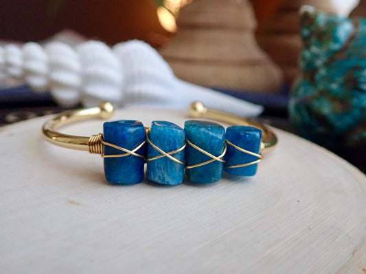 Gold Plated Bangle Bracelet with Raw Sapphires – Wire Wrapped Gemstone Cuff for Women