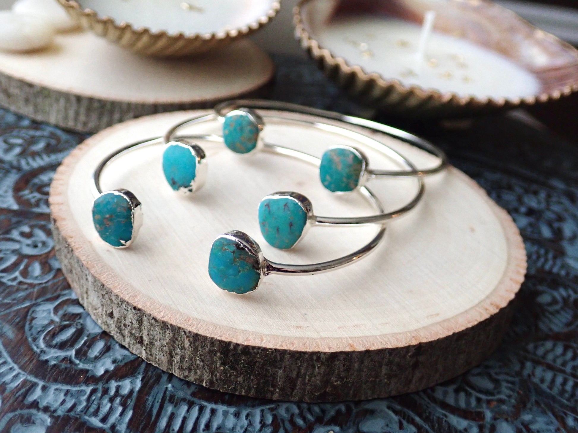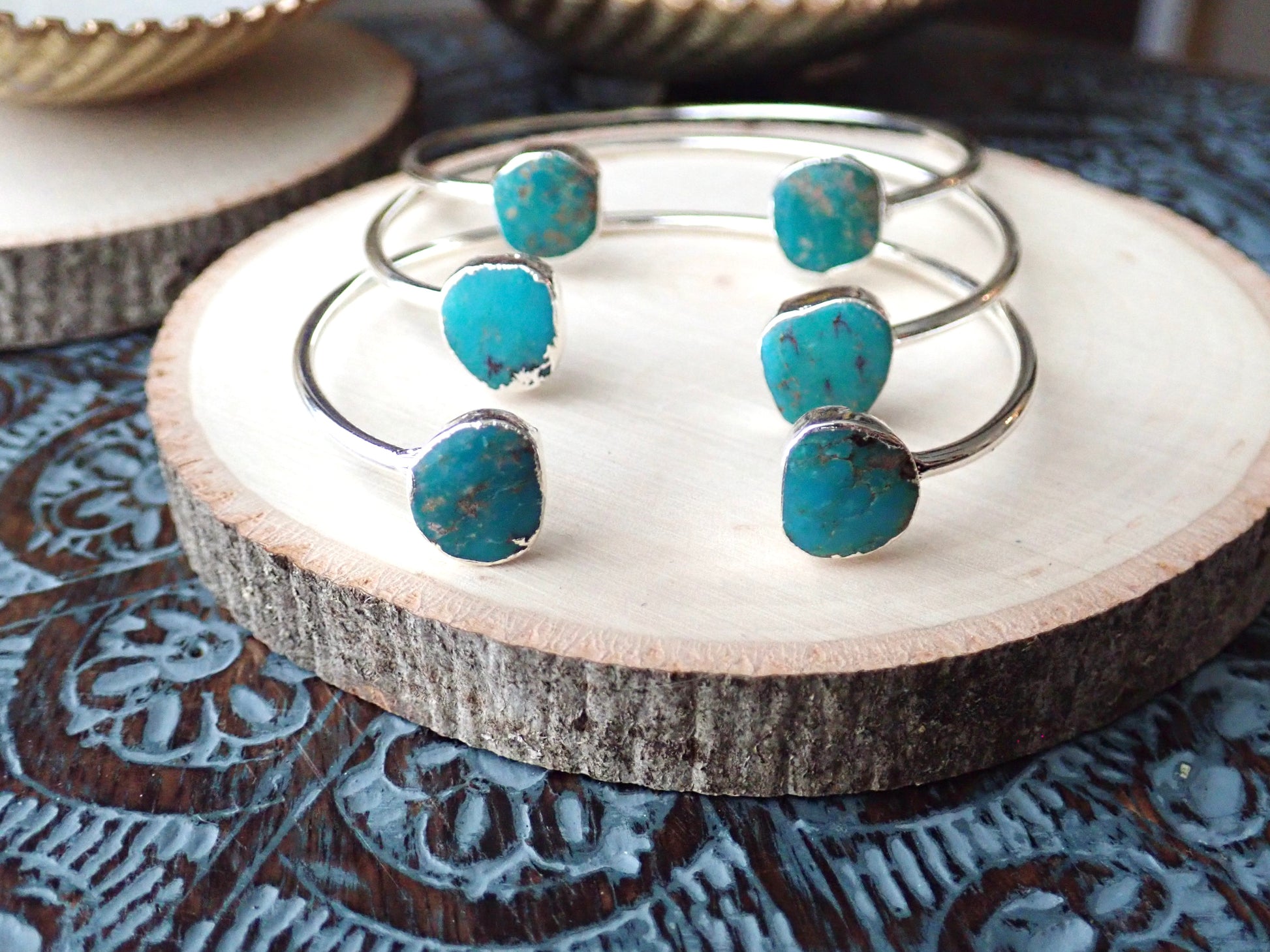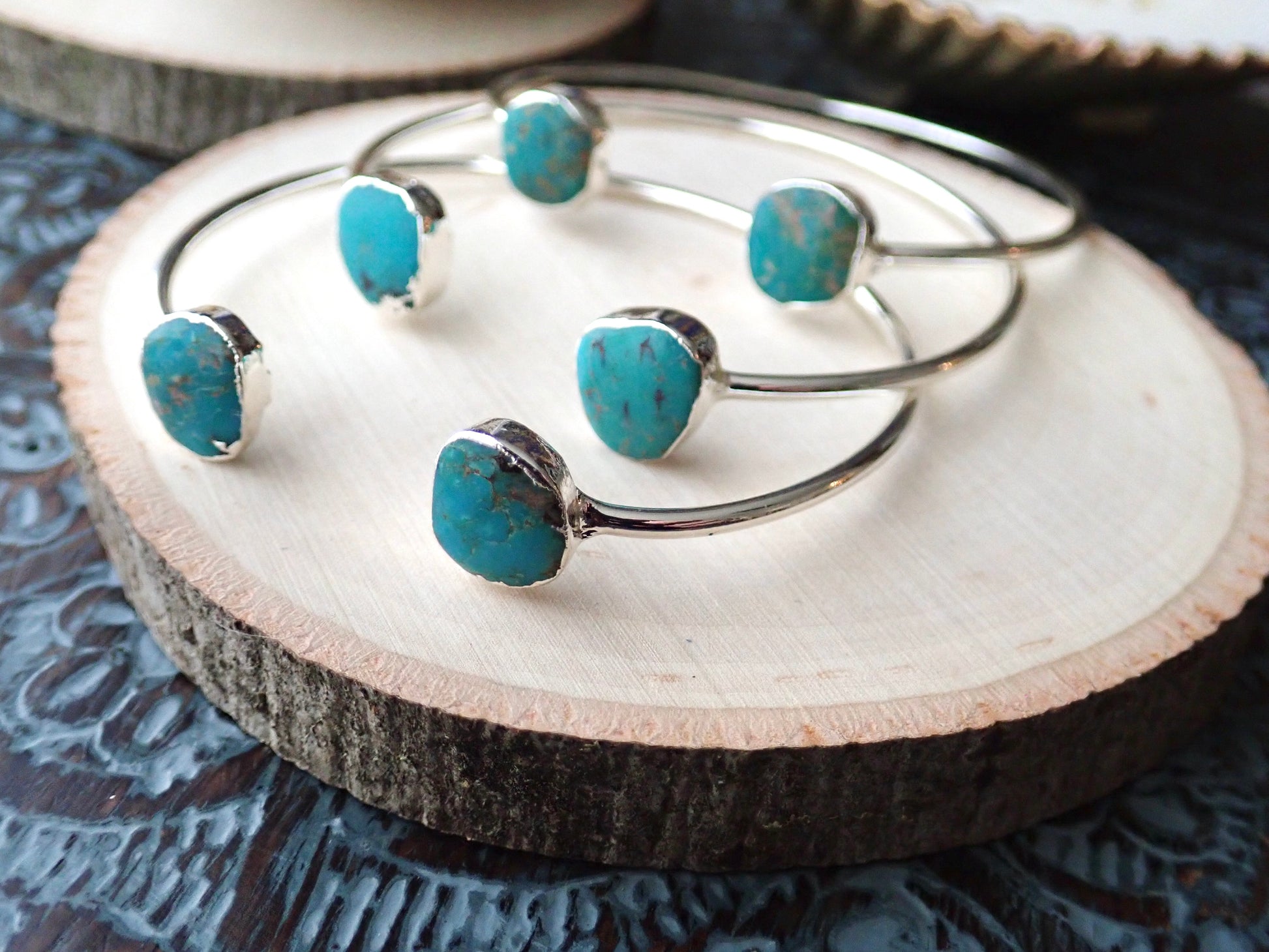 ★Gemstones: Genuine Turquoise ★Stones vary in size but most are about 10mm ★Bangle Sterling Silver plated over brass ★Adjustable to your wrist, can be worn as in photos or crossed over like in 2nd photo. ★All stones unique but have been matched for color and size as best as possible. ★Arrives ready for gifting in a cute boho gift box
