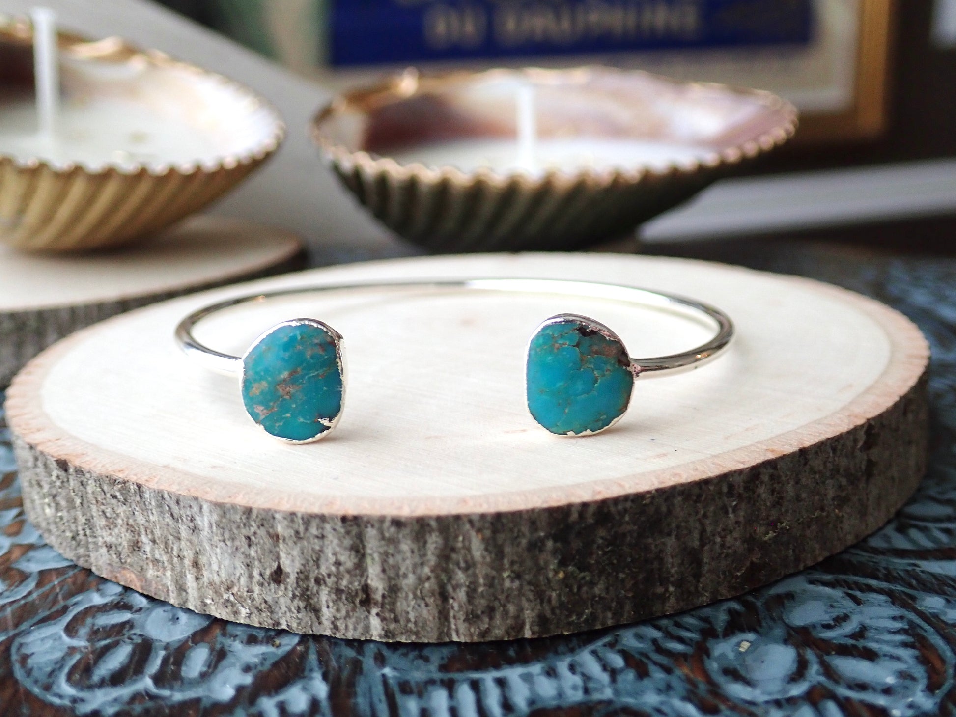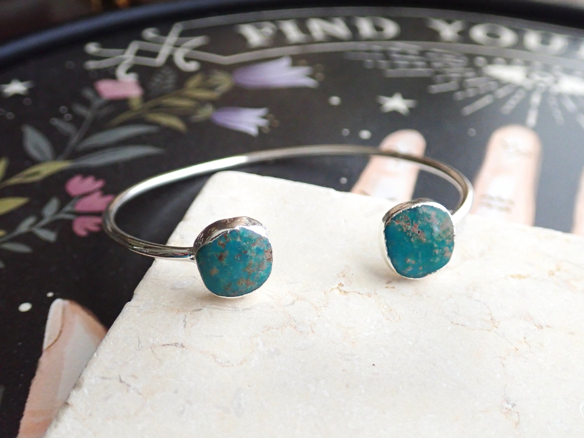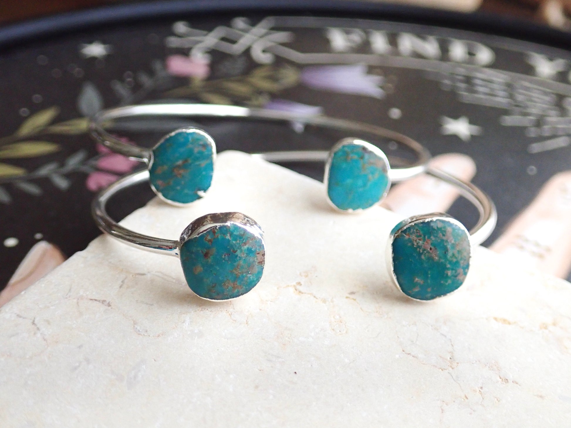 ★Gemstones: Genuine Turquoise ★Stones vary in size but most are about 10mm ★Bangle Sterling Silver plated over brass ★Adjustable to your wrist, can be worn as in photos or crossed over like in 2nd photo. ★All stones unique but have been matched for color and size as best as possible. ★Arrives ready for gifting in a cute boho gift box