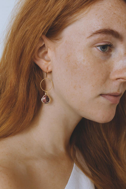 Dusty Rose Glass Charm Hoop Earrings, Gold Hoop Earrings with Crystal Teardrop, Gemstone Dangle Earrings