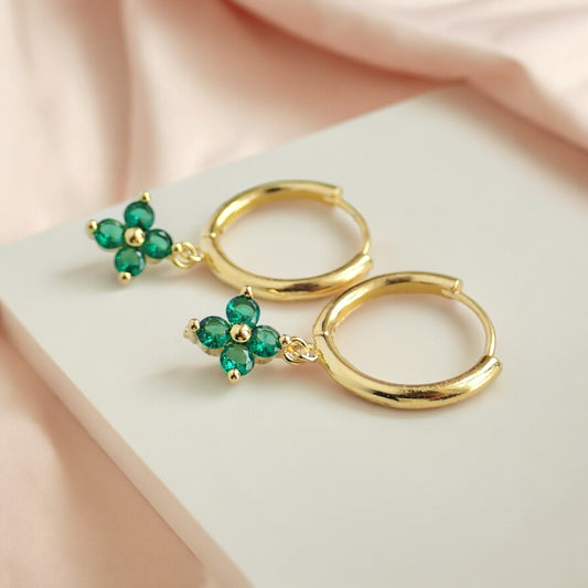 Emerald Green Flower Crystal Huggie Hoops – 14k Gold Vermeil Sterling Silver – Dainty Small Hoop Earrings – May Birthstone Gift for Her