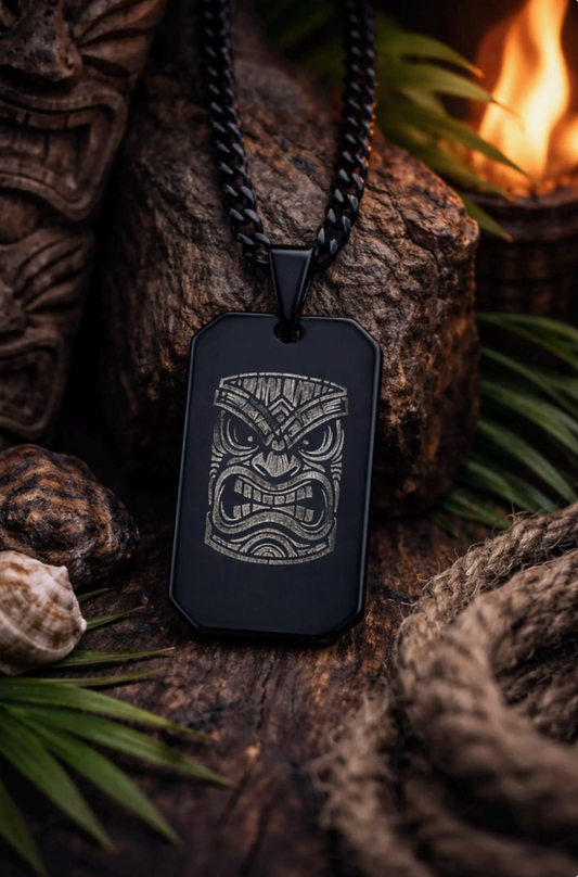 Tiki Mask Dog Tag Necklace - Surfer Jewelry, Gift for Men