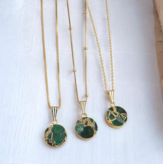 Emerald Jade Necklace Gold, Green Crystal Coin Pendant, Mojave Gemstone Necklace, May Birthstone Gift for Her, Dainty Minimalist Jewelry