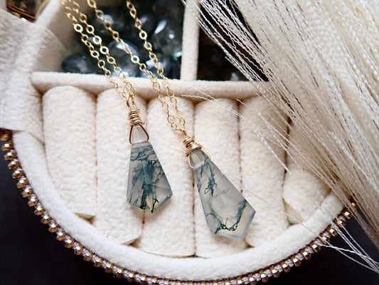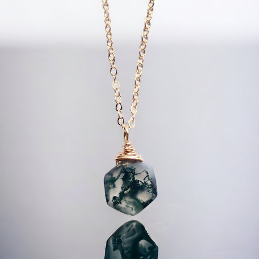 Moss Agate Necklace - Hexagon Cut Gemstone -18K Gold Filled Chain