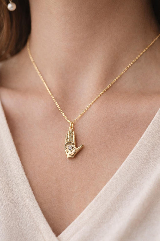 Hamsa Hand Necklace with Crystal, Gold Hand Pendant Necklace, Palm with Eye Necklace