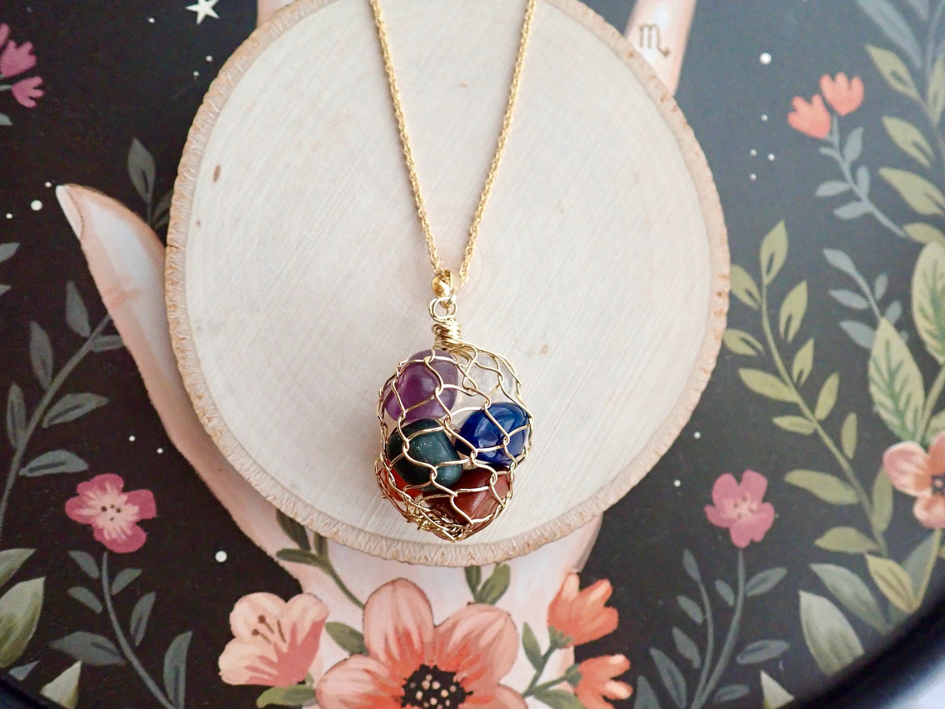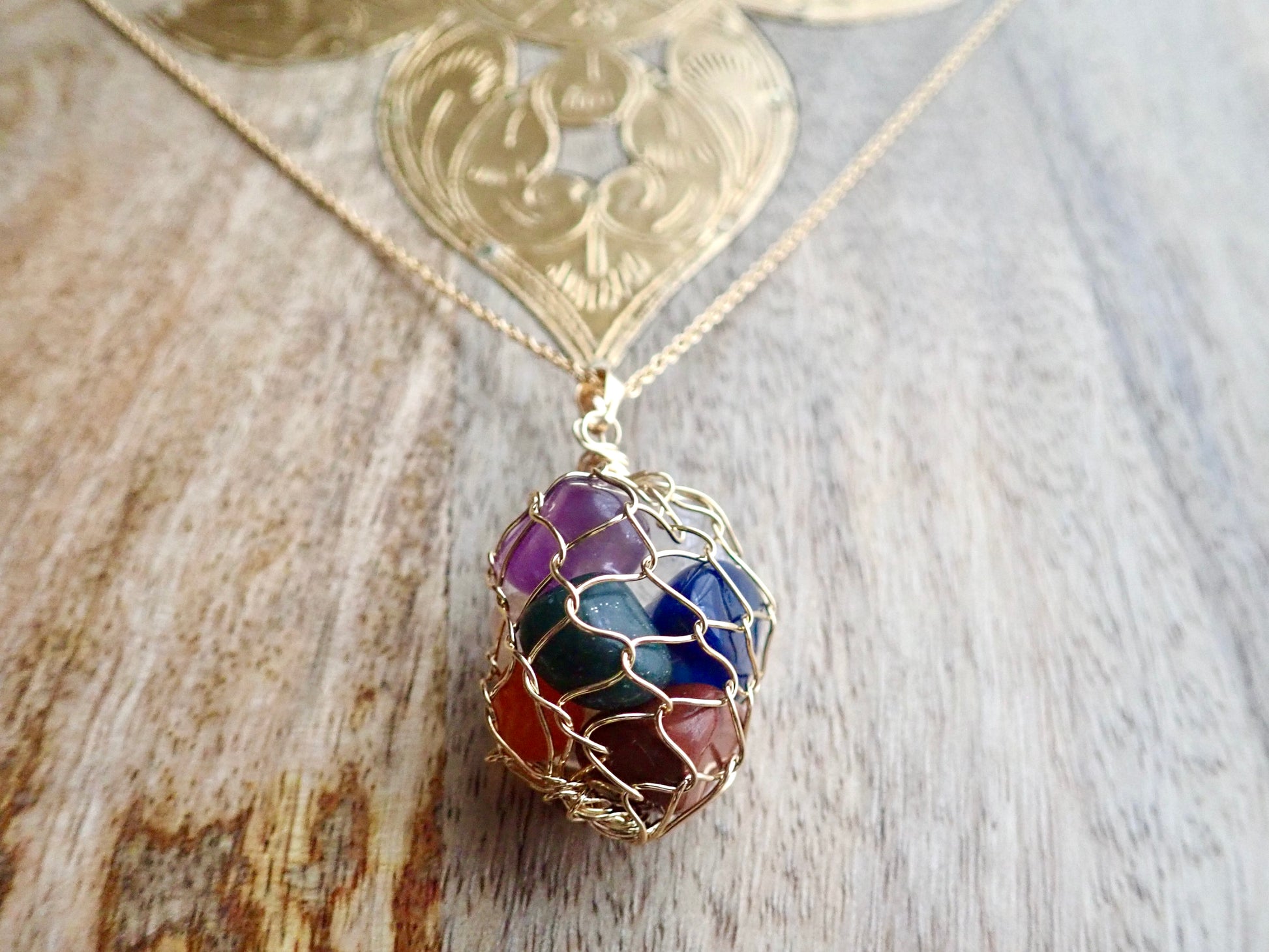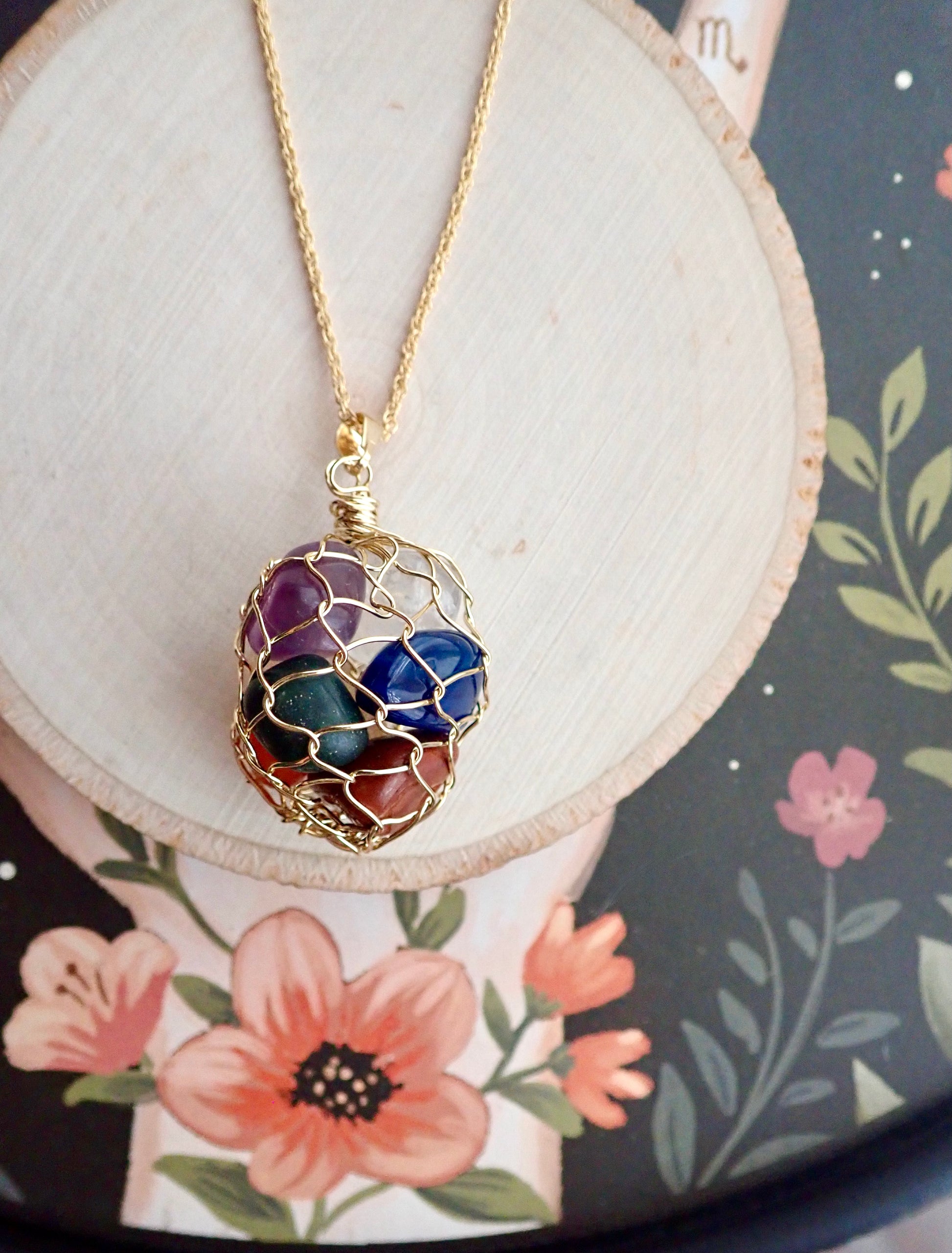 Align your spiritual energy and look fantastic while doing it! Seven tumbled chakra stones are bundled together in a handmade gold fill wire net pendant. Choose your length of high quality gold fill wheat chain.