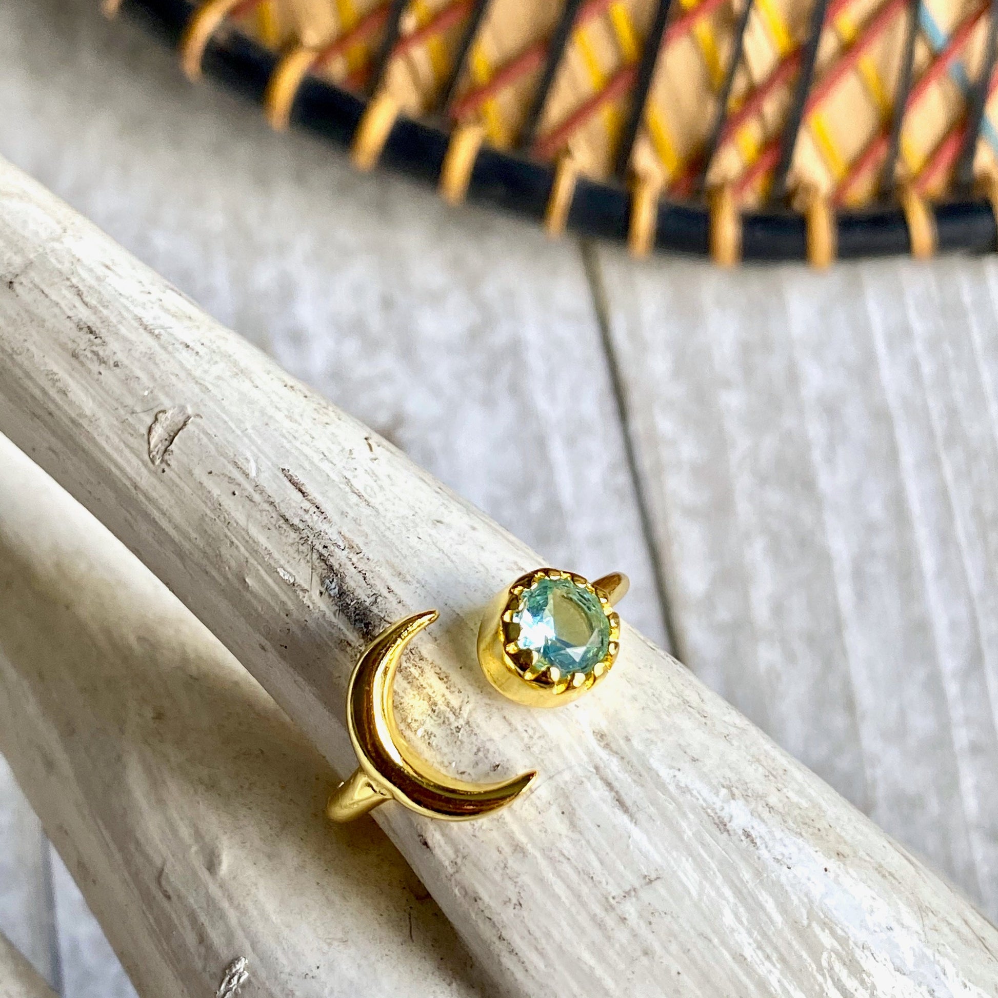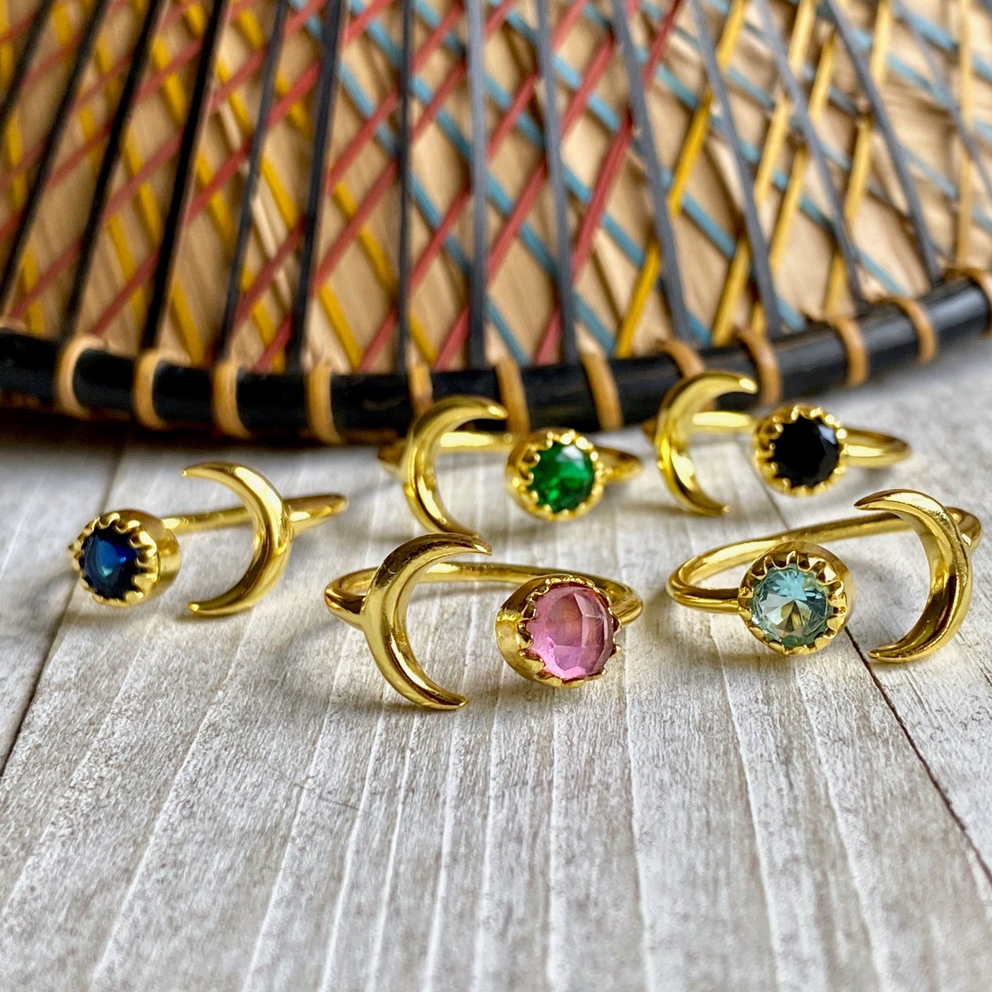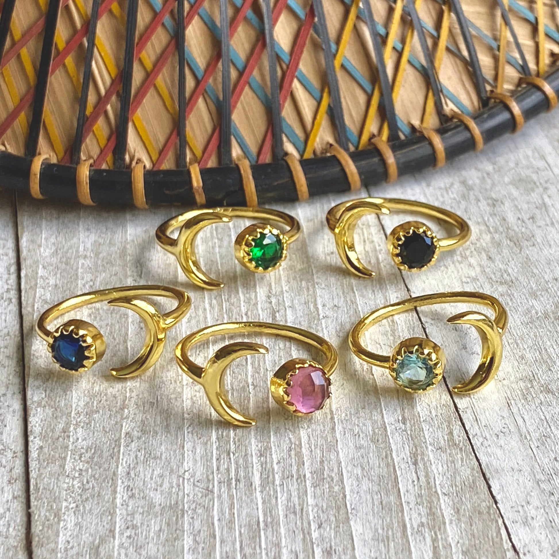 We're over the moon for these dainty celestially inspired stacking rings. High quality 14k gold plated and adjustable to boot. Open rings are the hot thing right now so get these while they last! Available in five different crystal glass colors. Here's a list of the colors with their traditional or alternate birthstone months: