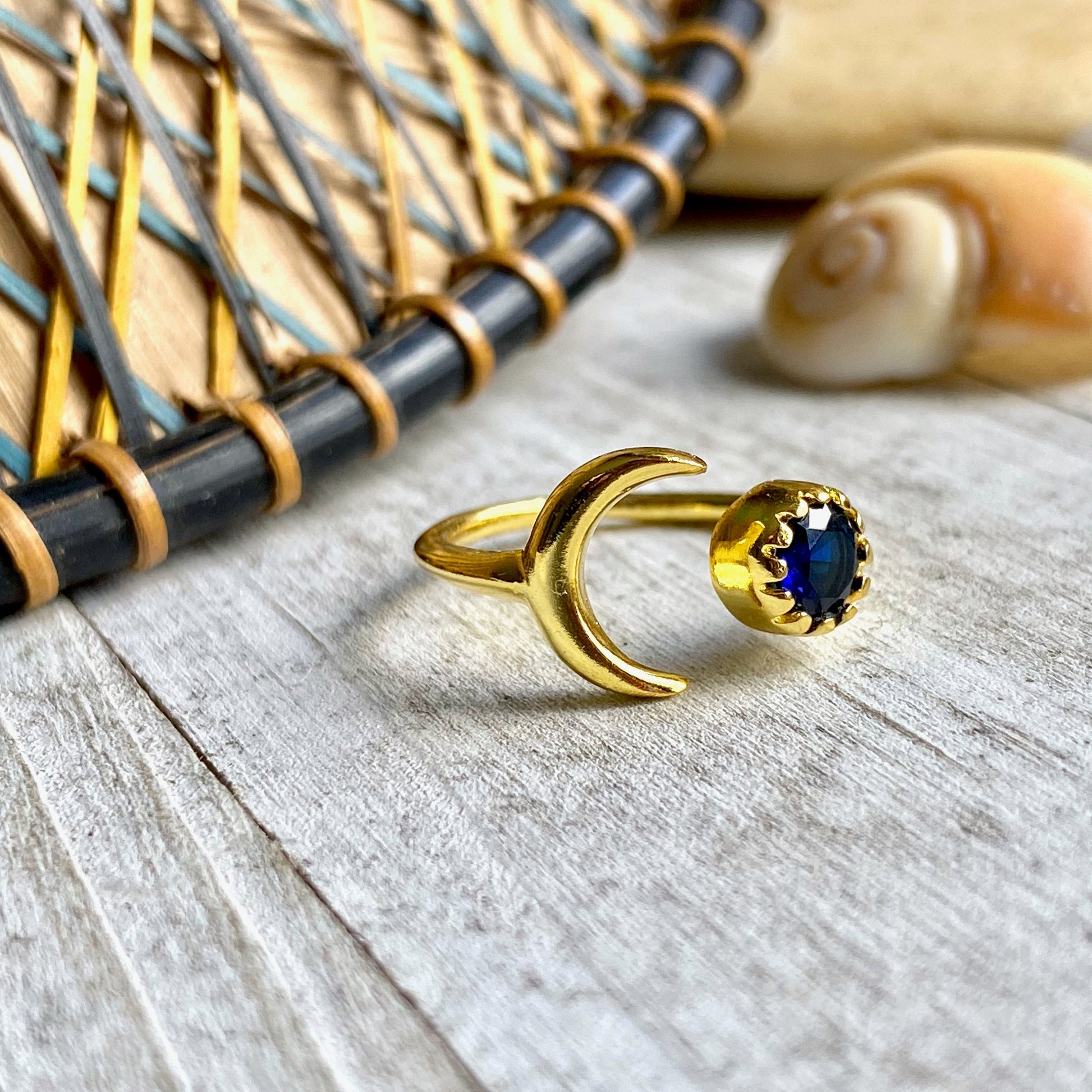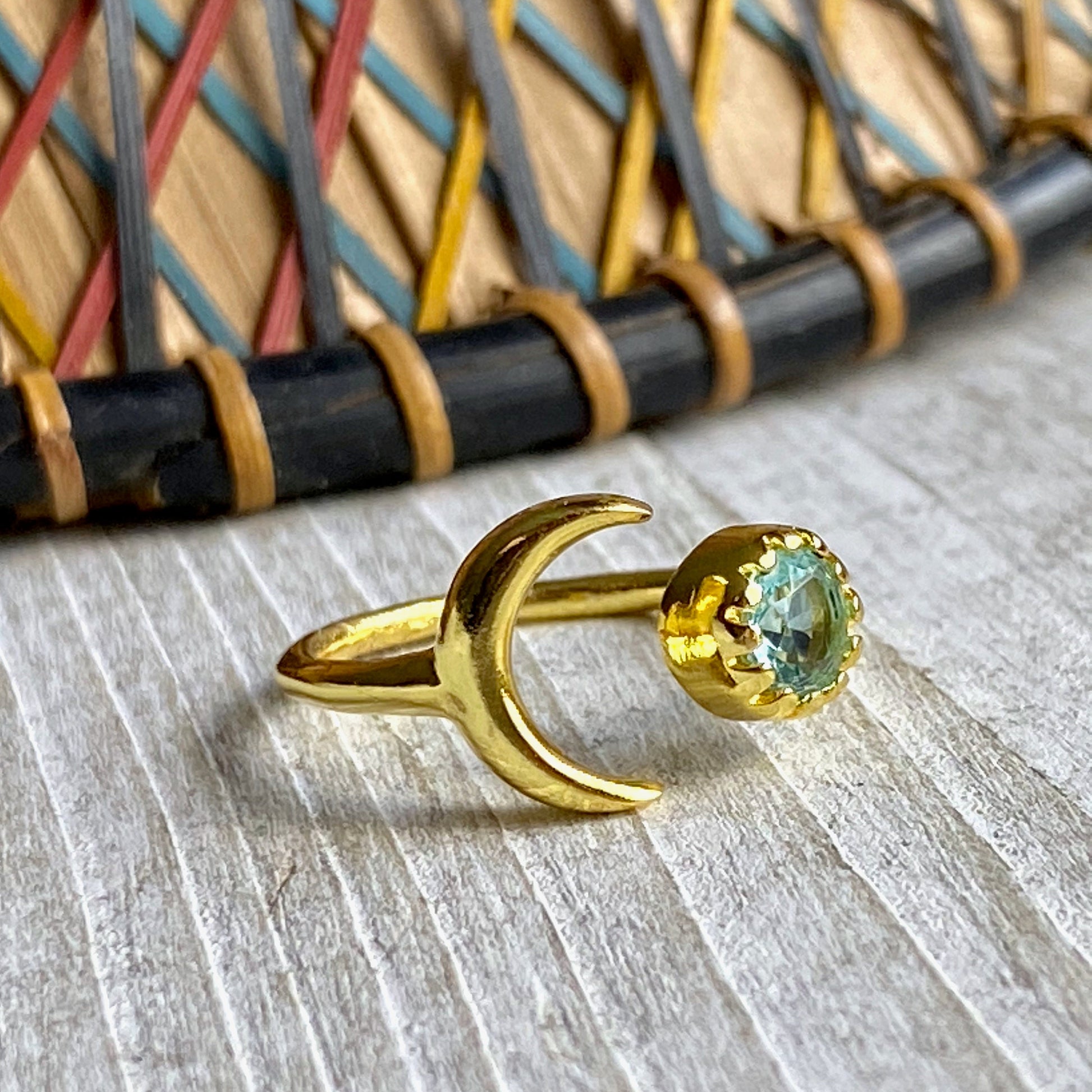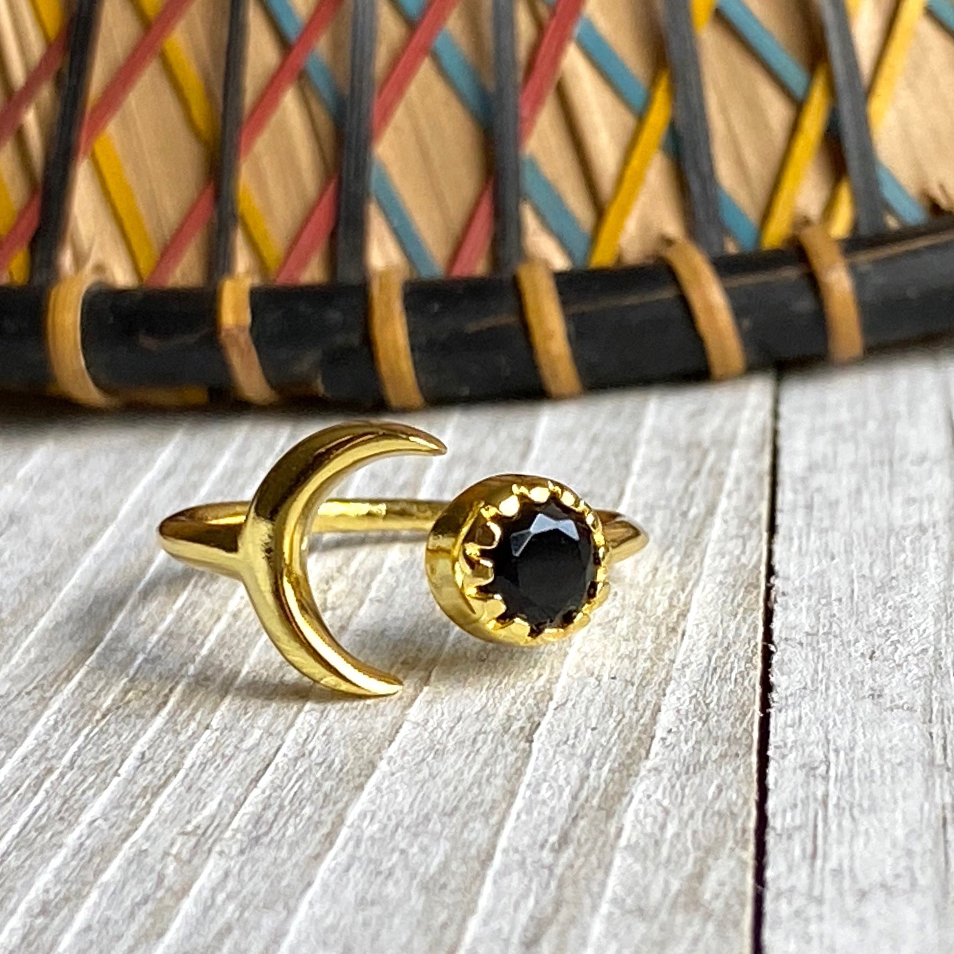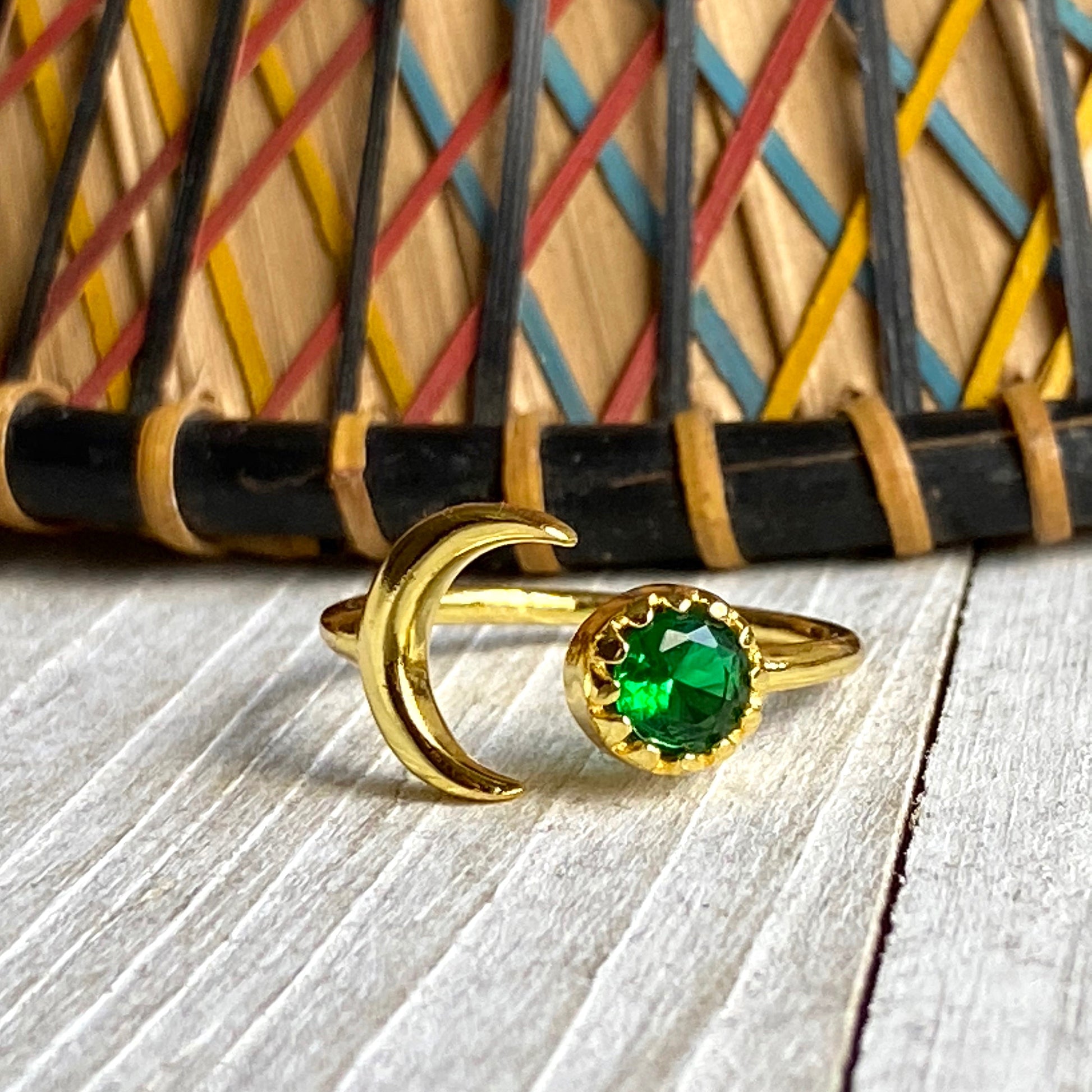 We're over the moon for these dainty celestially inspired stacking rings. High quality 14k gold plated and adjustable to boot. Open rings are the hot thing right now so get these while they last! Available in five different crystal glass colors. Here's a list of the colors with their traditional or alternate birthstone months: