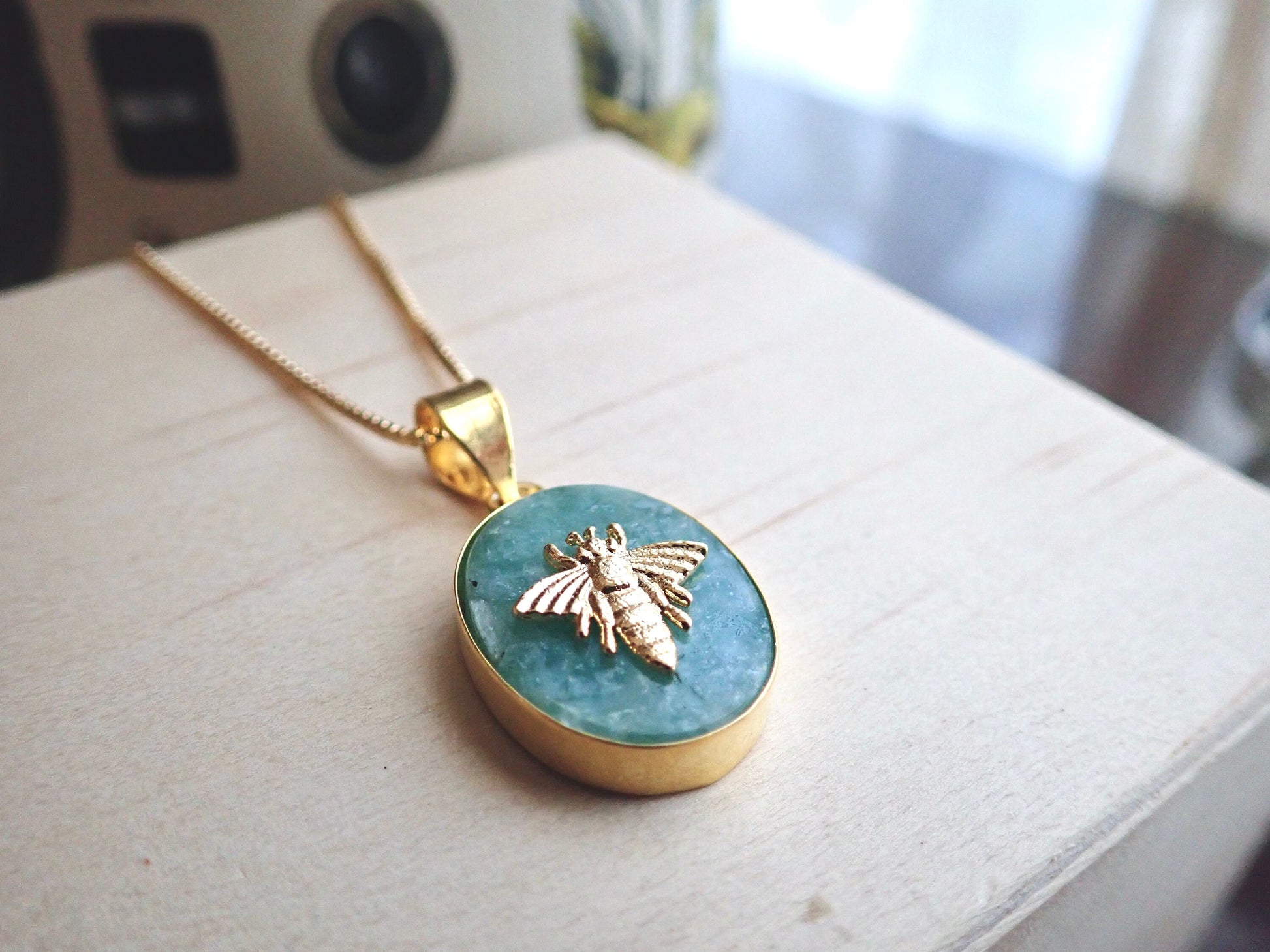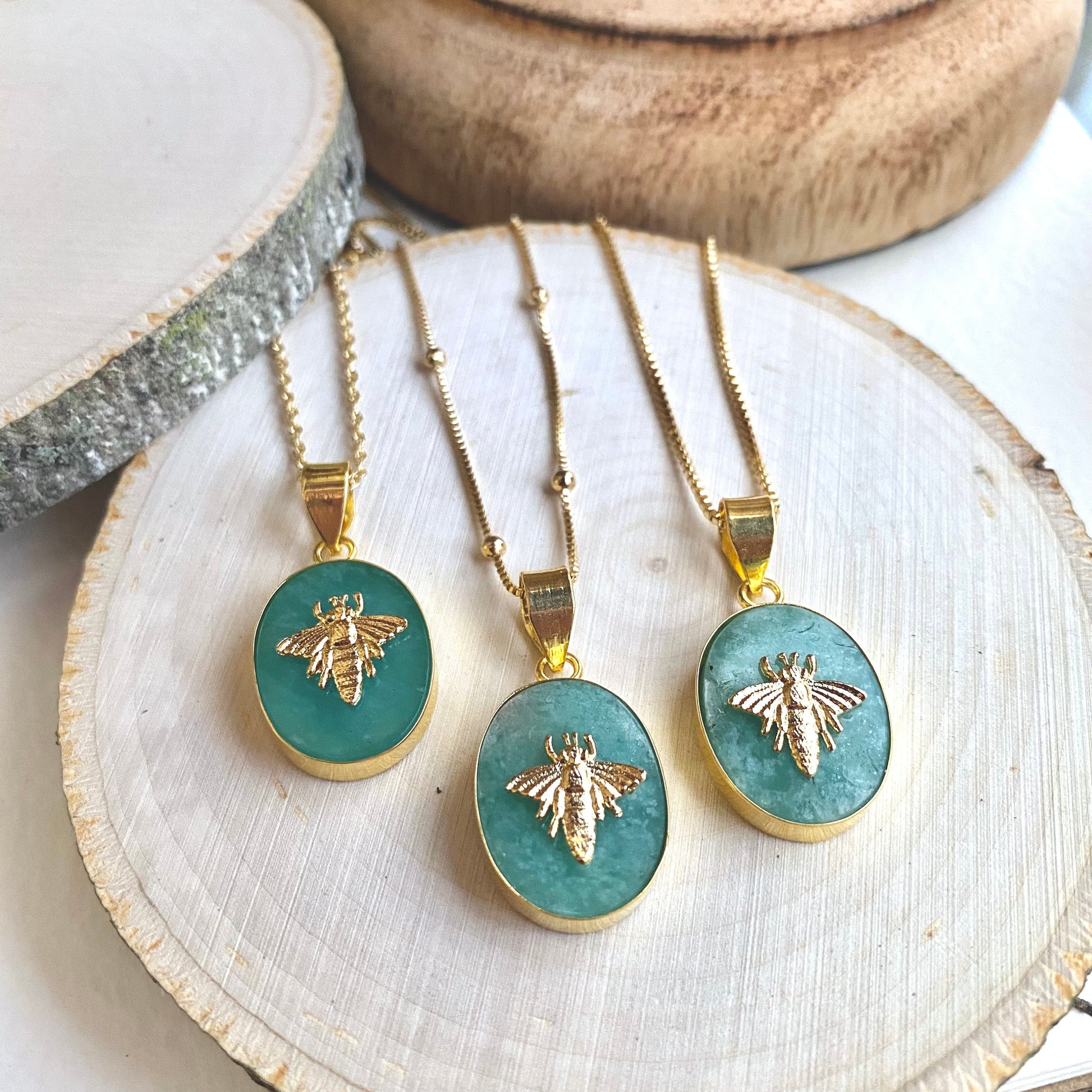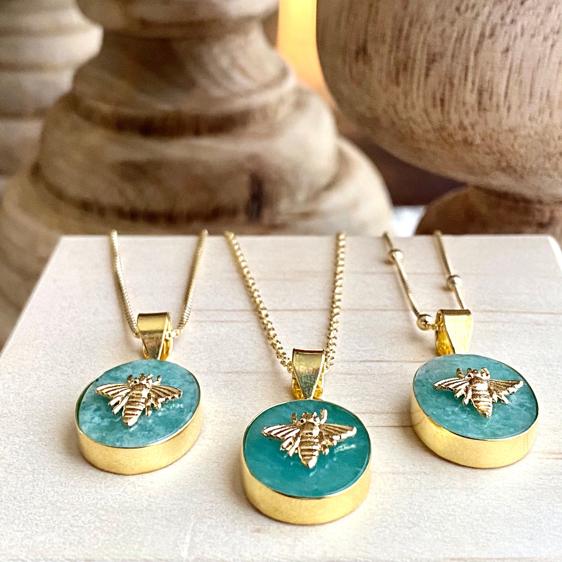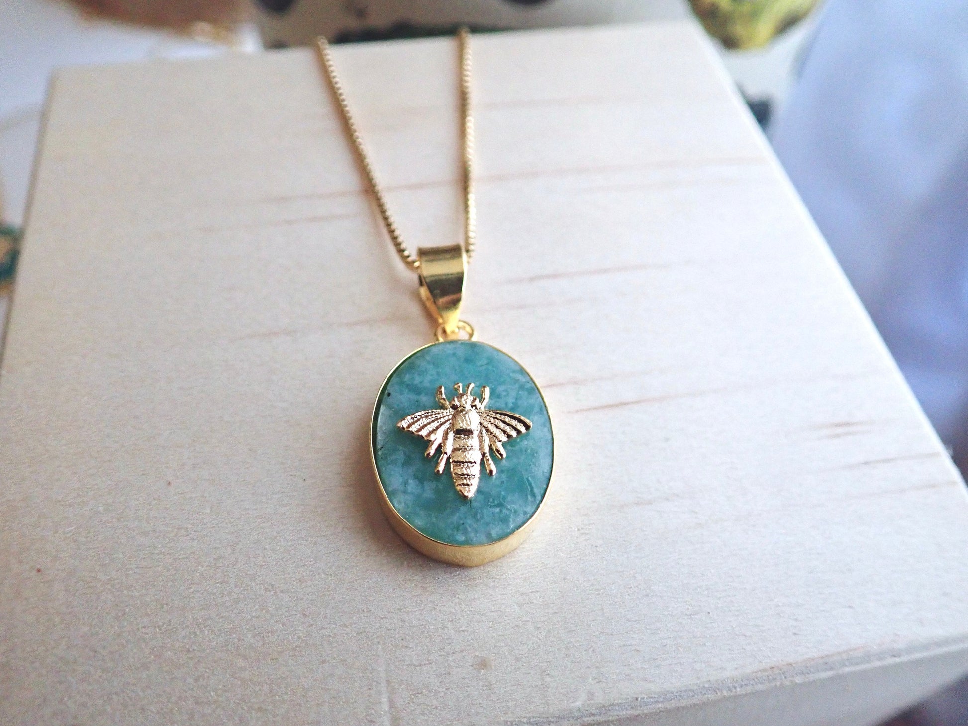 A darling little necklace featuring a charming and intricate gold honey bee and genuine amazonite. The perfect gift for someone you love and full of special meaning. The bee, as a totem animal, are for those whose greatest wish is for all living things to co-exist in peace and harmony. In Egypt, the bee was a symbol of royalty and power. This comes from the legend that the bee was born from the tears of Ra, In Renaissance times, the bee was a symbol of love and associated with Cupid. Metaphysical Properties Amazonite is a stone of peace, truth, harmony, and communication. It gently soothes the nerves. It’s been called the “peacemaker stone” due to its soothing nature and communicative abilities.
