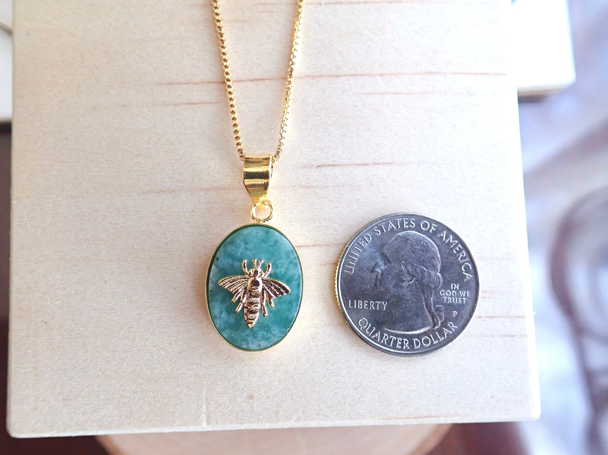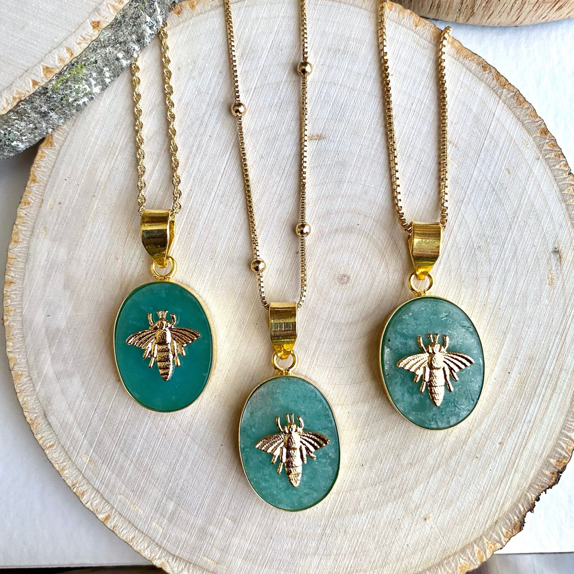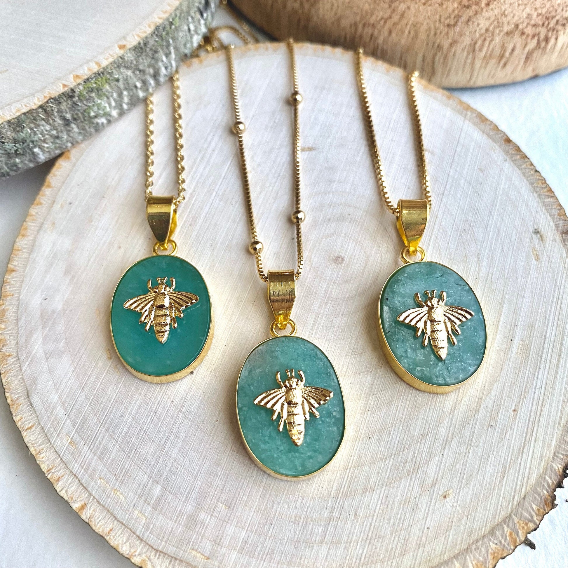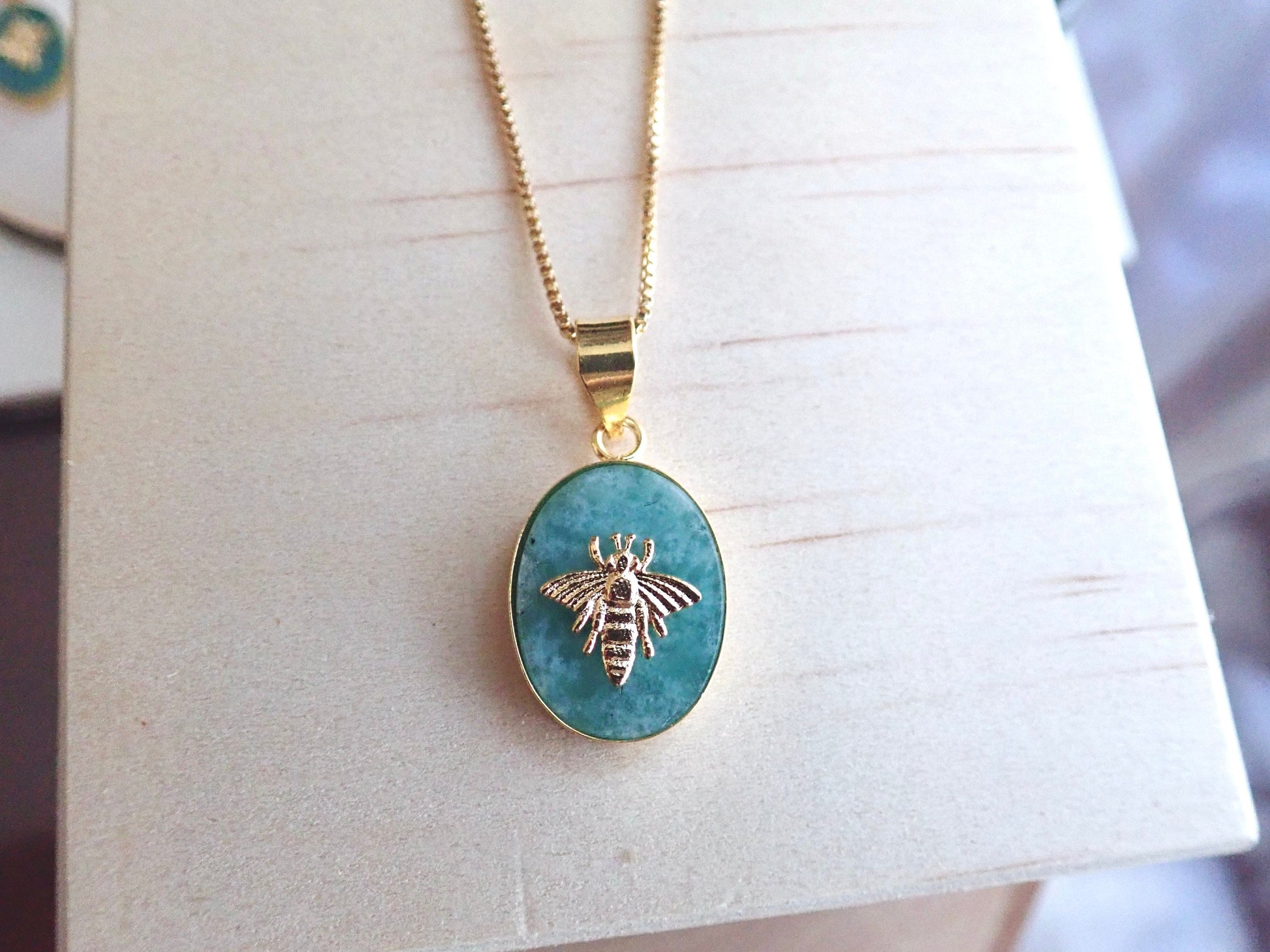 A darling little necklace featuring a charming and intricate gold honey bee and genuine amazonite. The perfect gift for someone you love and full of special meaning. The bee, as a totem animal, are for those whose greatest wish is for all living things to co-exist in peace and harmony. In Egypt, the bee was a symbol of royalty and power. This comes from the legend that the bee was born from the tears of Ra, In Renaissance times, the bee was a symbol of love and associated with Cupid. Metaphysical Properties Amazonite is a stone of peace, truth, harmony, and communication. It gently soothes the nerves. It’s been called the “peacemaker stone” due to its soothing nature and communicative abilities.