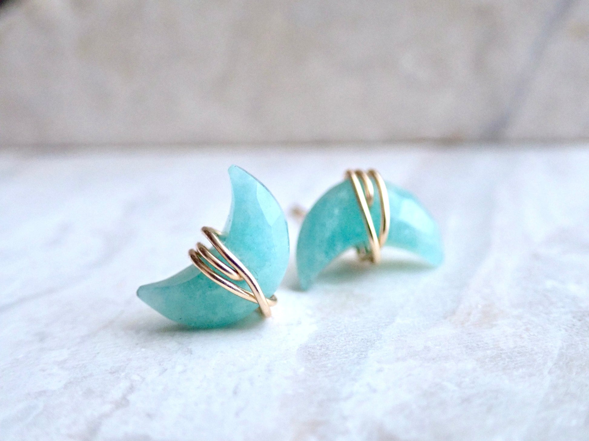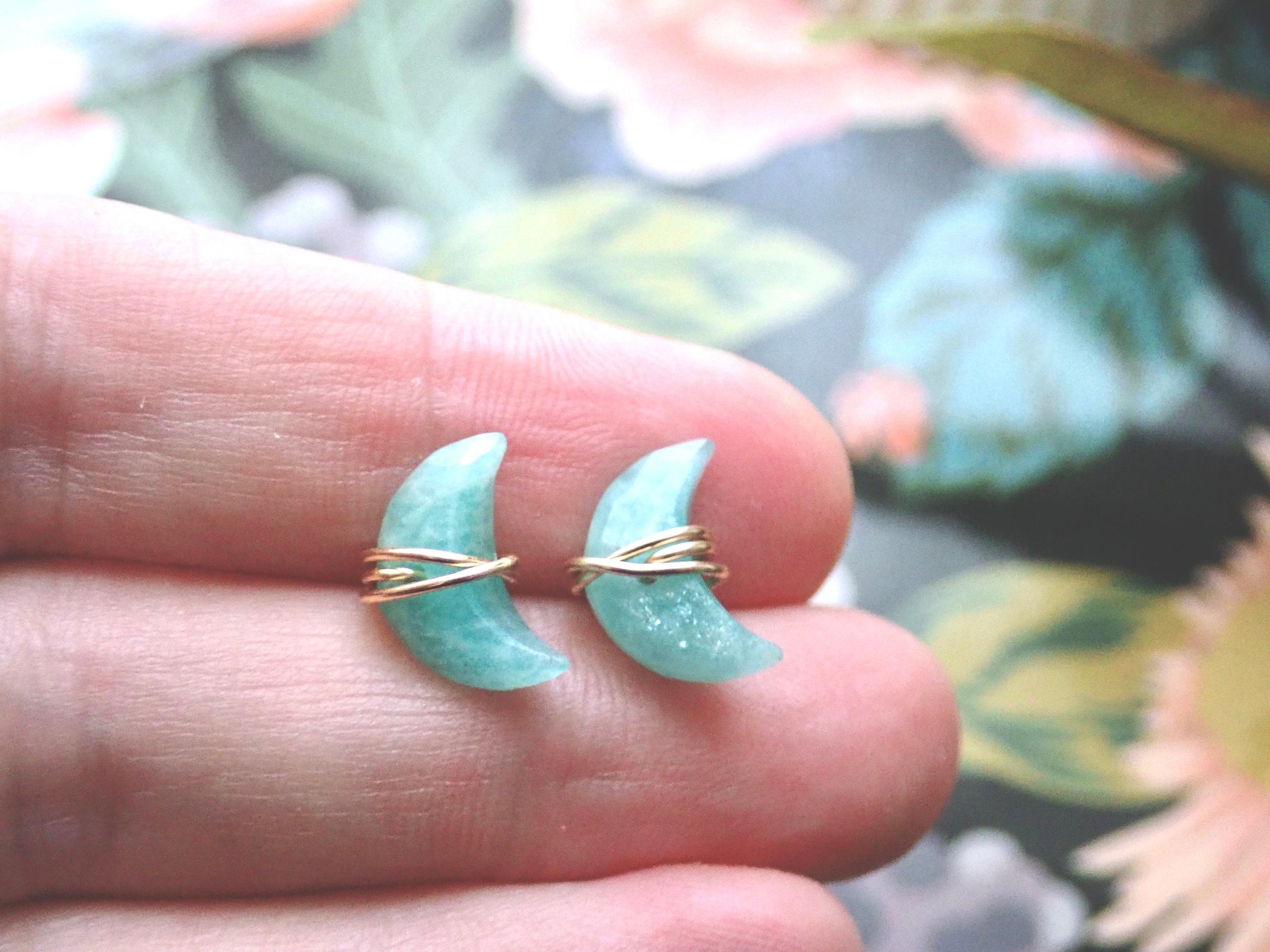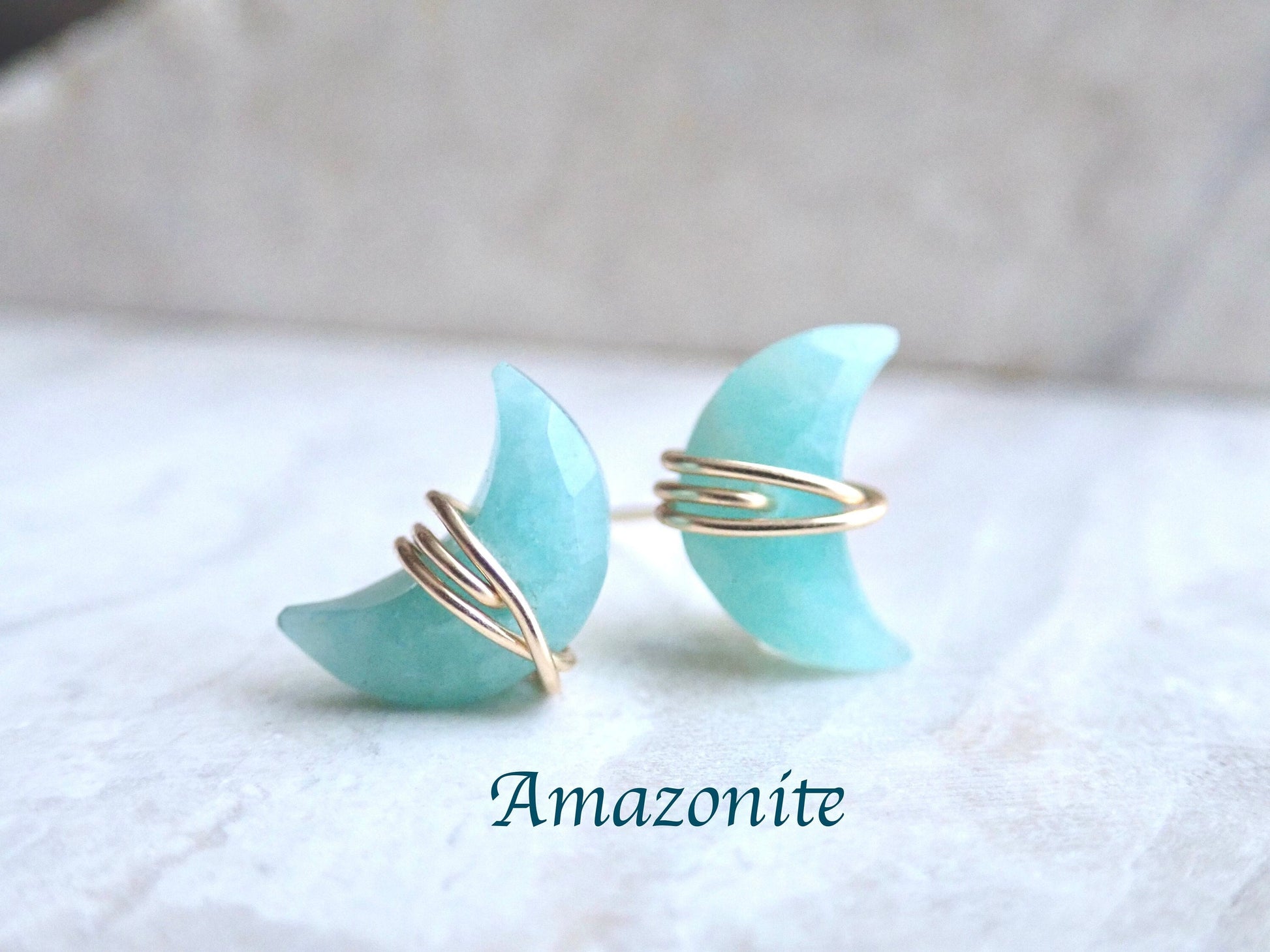 Amazonite Stud Earrings | Crescent Moon Earrings, Wire Wrapped Stone Gemstone Post
