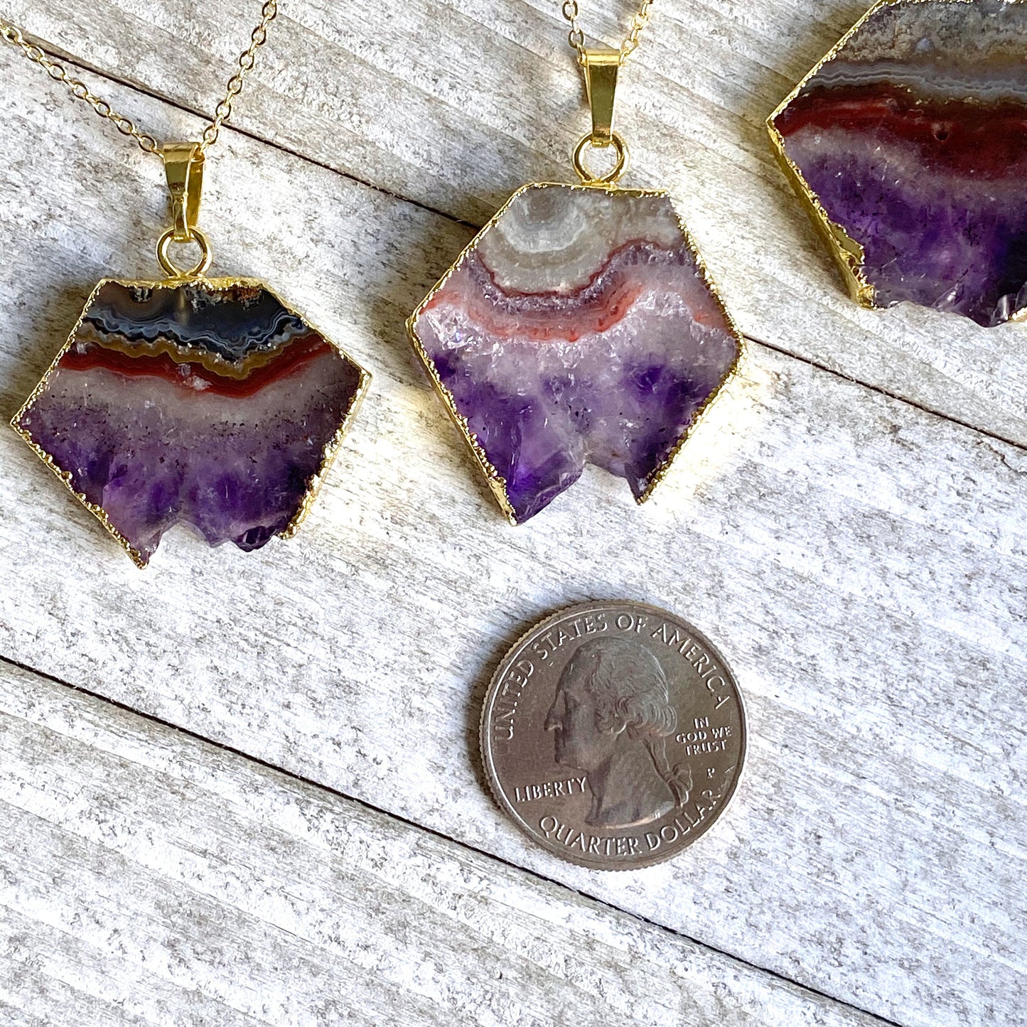 This piece is polished on both sides, dipped in 24k gold and measures approximately 1.4" high by 1.25" including loops, although due to the uniqueness of each slice the measurements vary slightly from one to the next. It is hung from a beautiful and high quality gold fill chain.