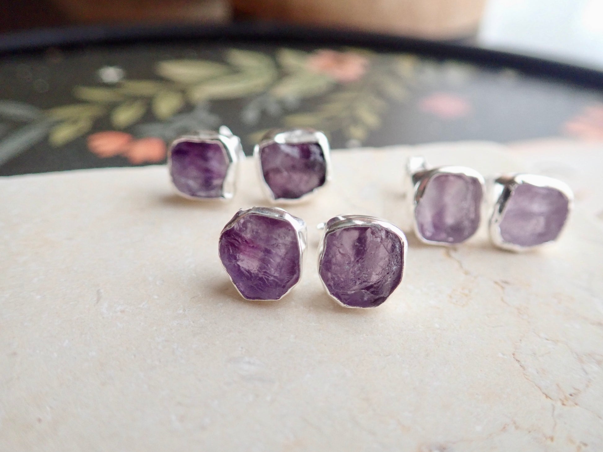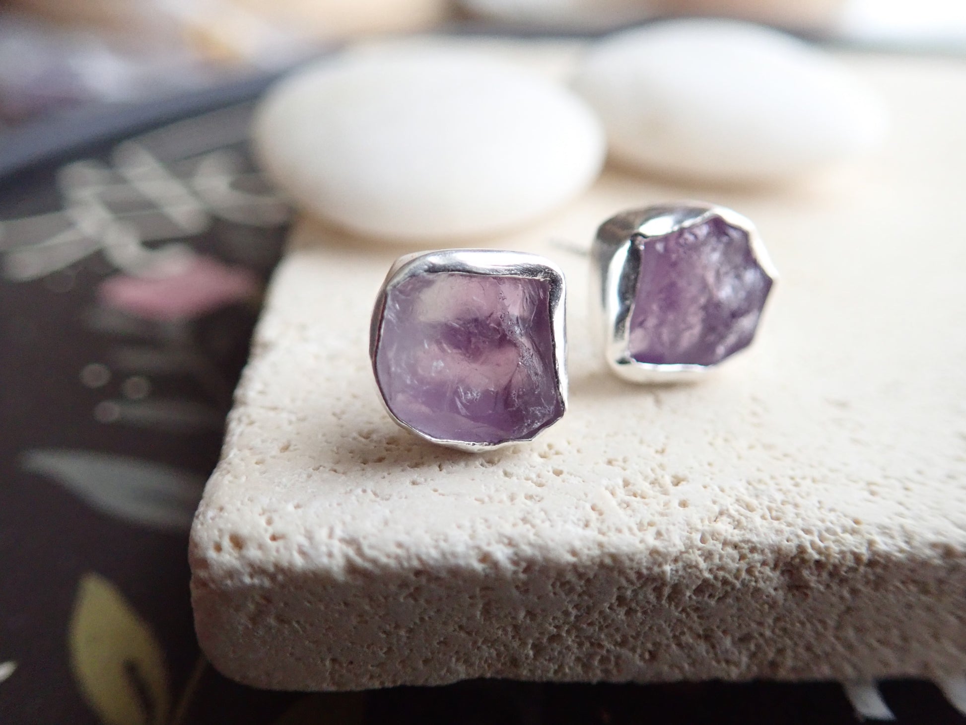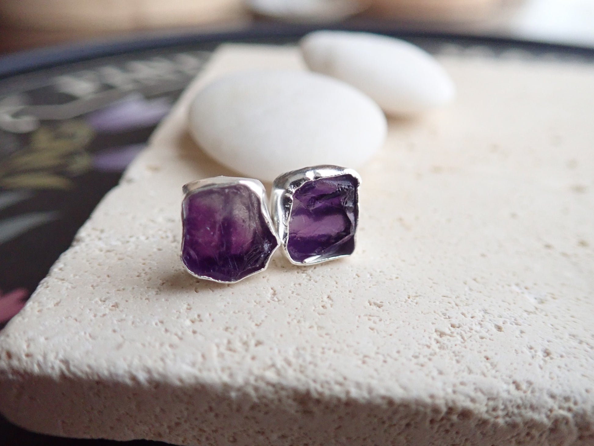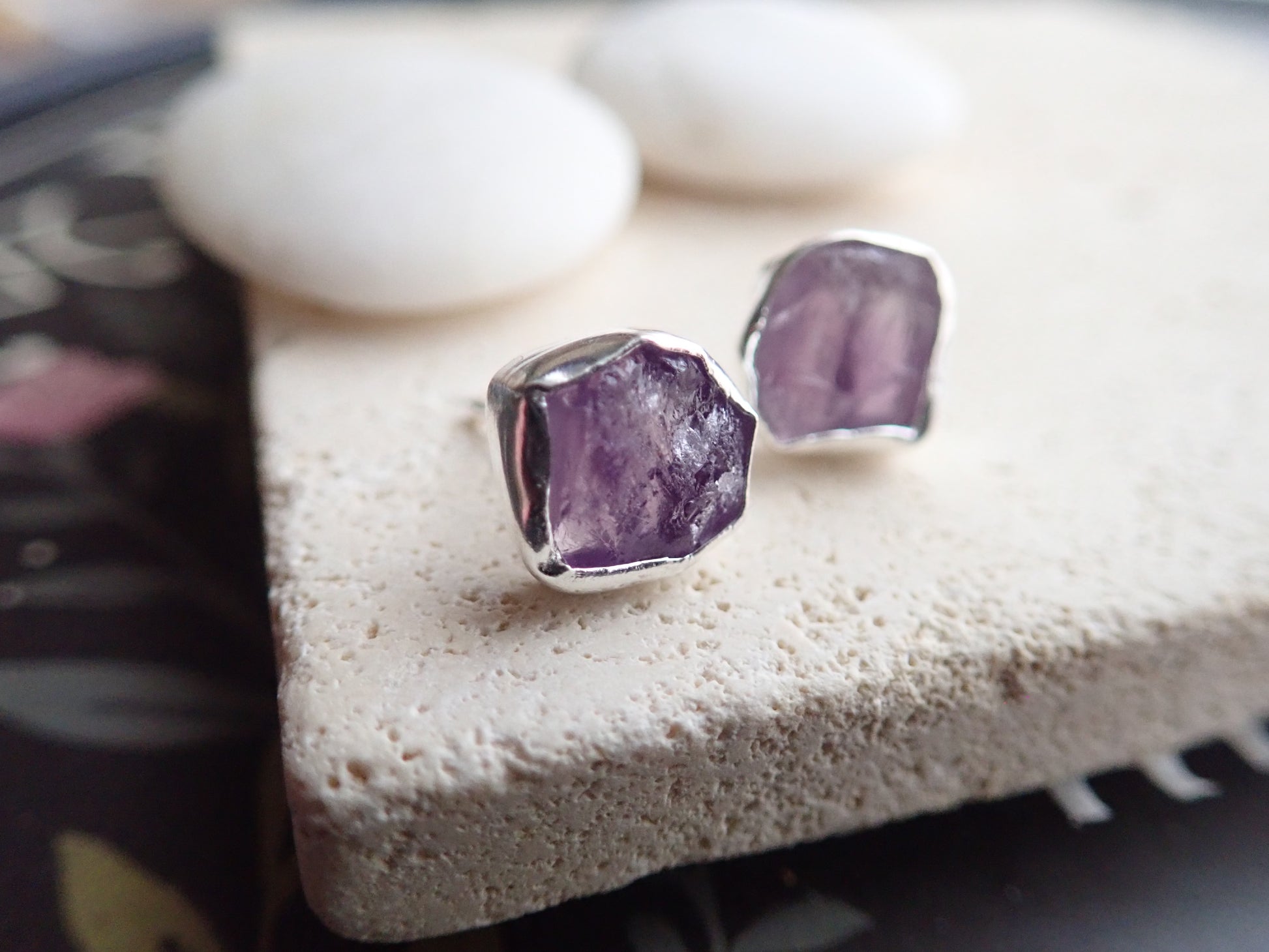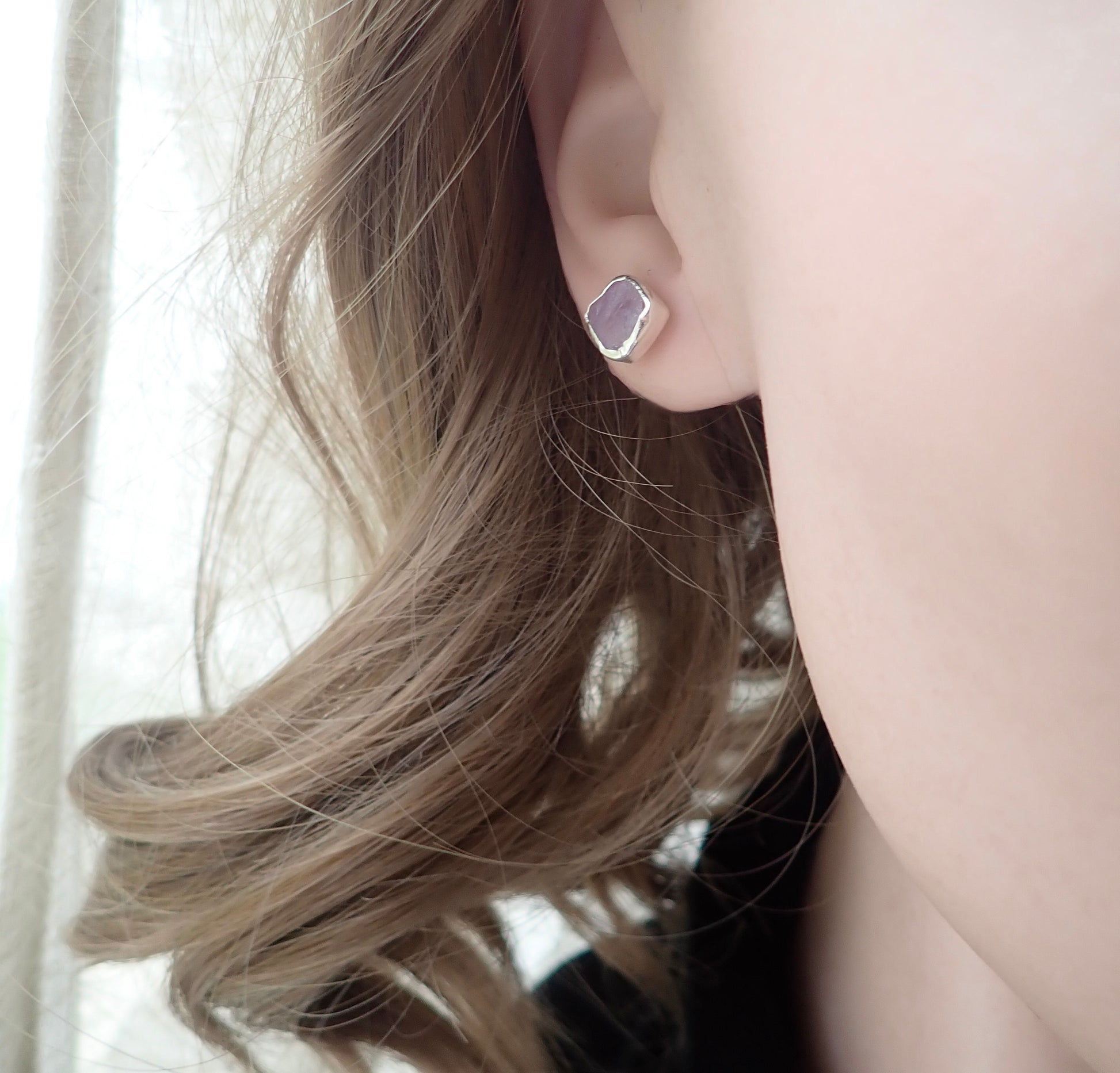 Beautifully redesign of our most popular stud earrings. This new design features an open-back bezel setting and is 100% hypo-allergenic sterling silver. Natural and raw amethysts are tightly set into and surrounded by the sterling silver bezel. The February birthstone, amethyst, is said to strengthen relationships and give its wearer courage. At one time, only royalty could wear the gem. Ancient Greeks thought that the amethyst guarded against intoxication. In fact, “amethyst” comes from amethystos, a Greek word meaning “sober.”