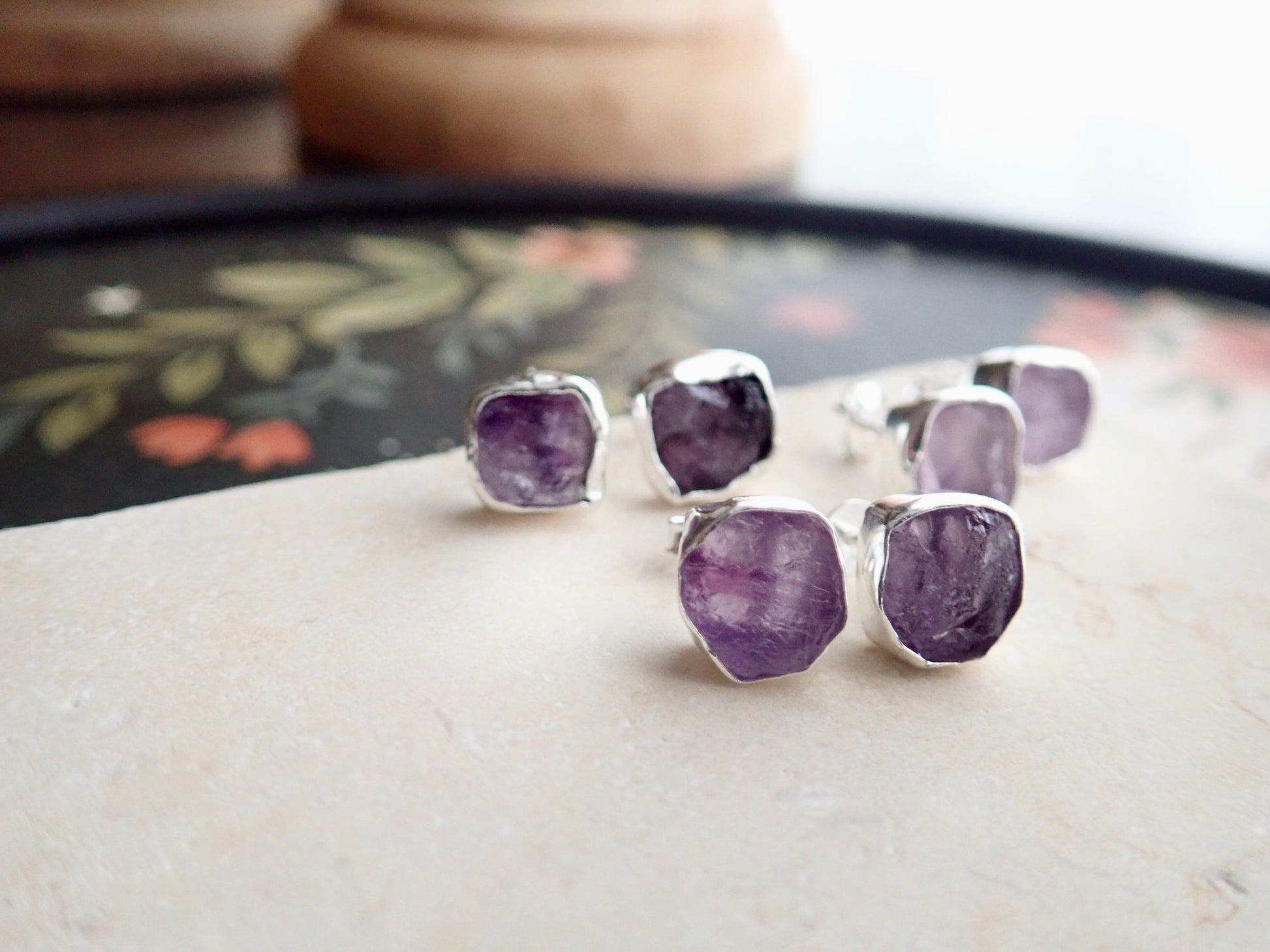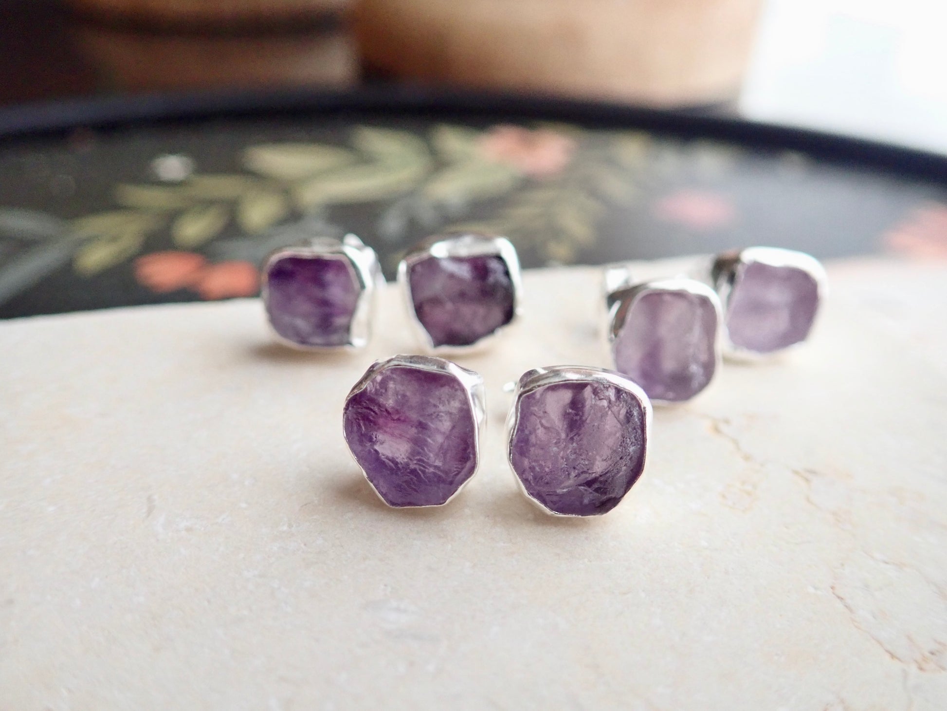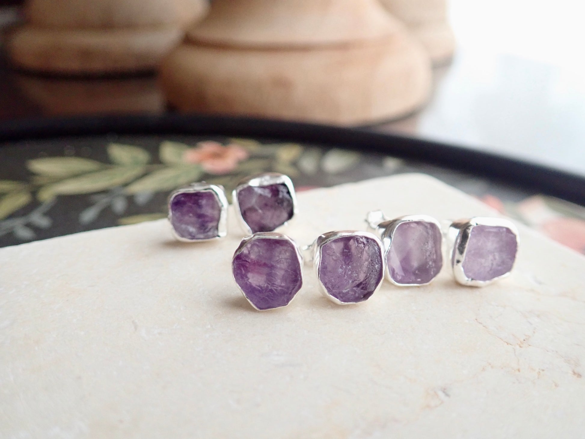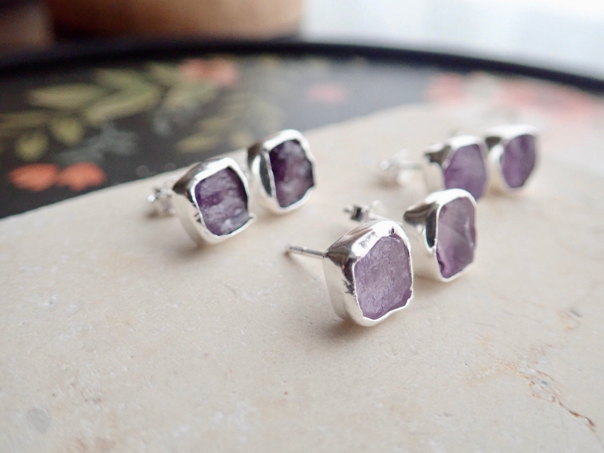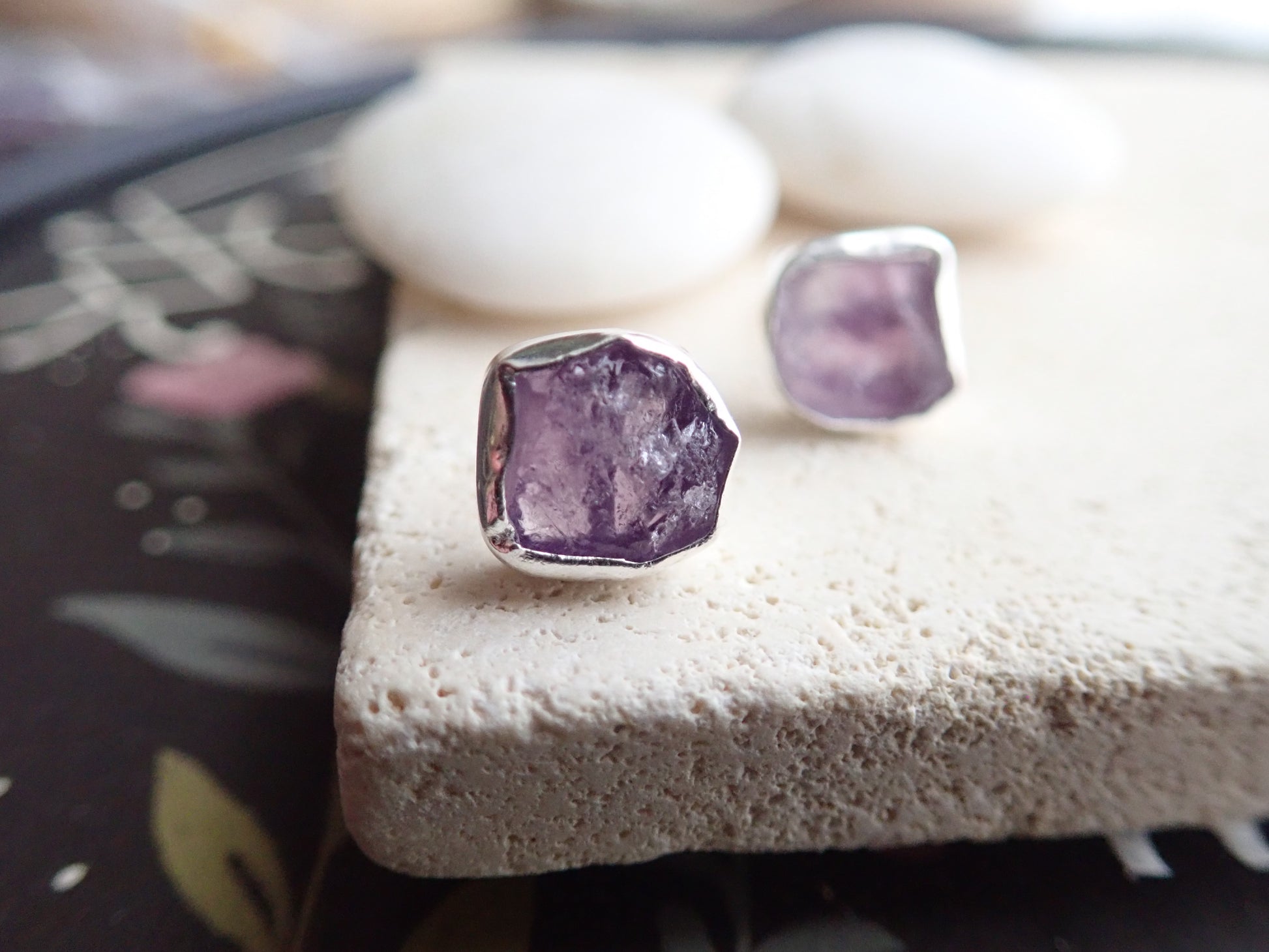 Beautifully redesign of our most popular stud earrings. This new design features an open-back bezel setting and is 100% hypo-allergenic sterling silver. Natural and raw amethysts are tightly set into and surrounded by the sterling silver bezel. The February birthstone, amethyst, is said to strengthen relationships and give its wearer courage. At one time, only royalty could wear the gem. Ancient Greeks thought that the amethyst guarded against intoxication. In fact, “amethyst” comes from amethystos, a Greek word meaning “sober.”