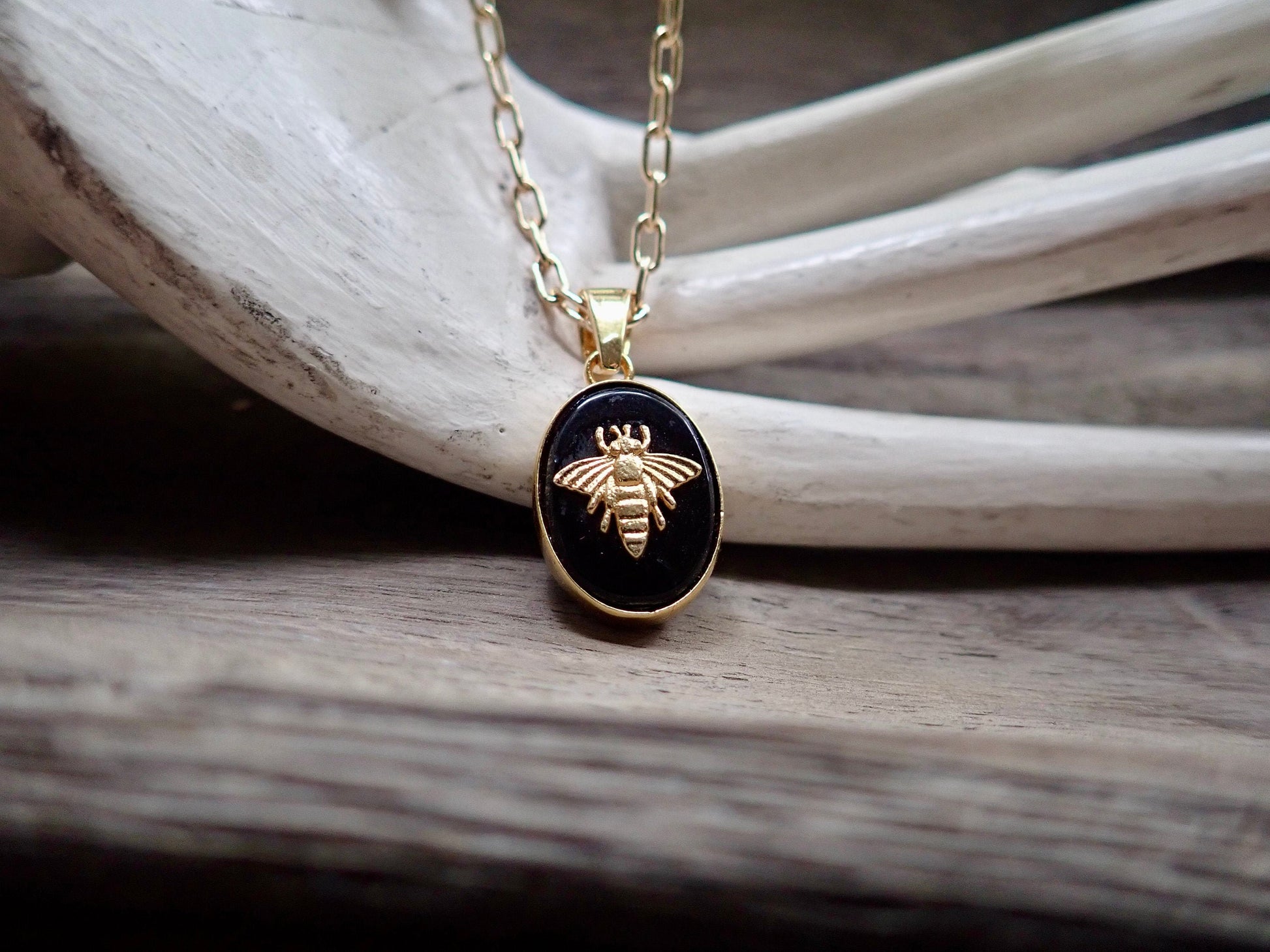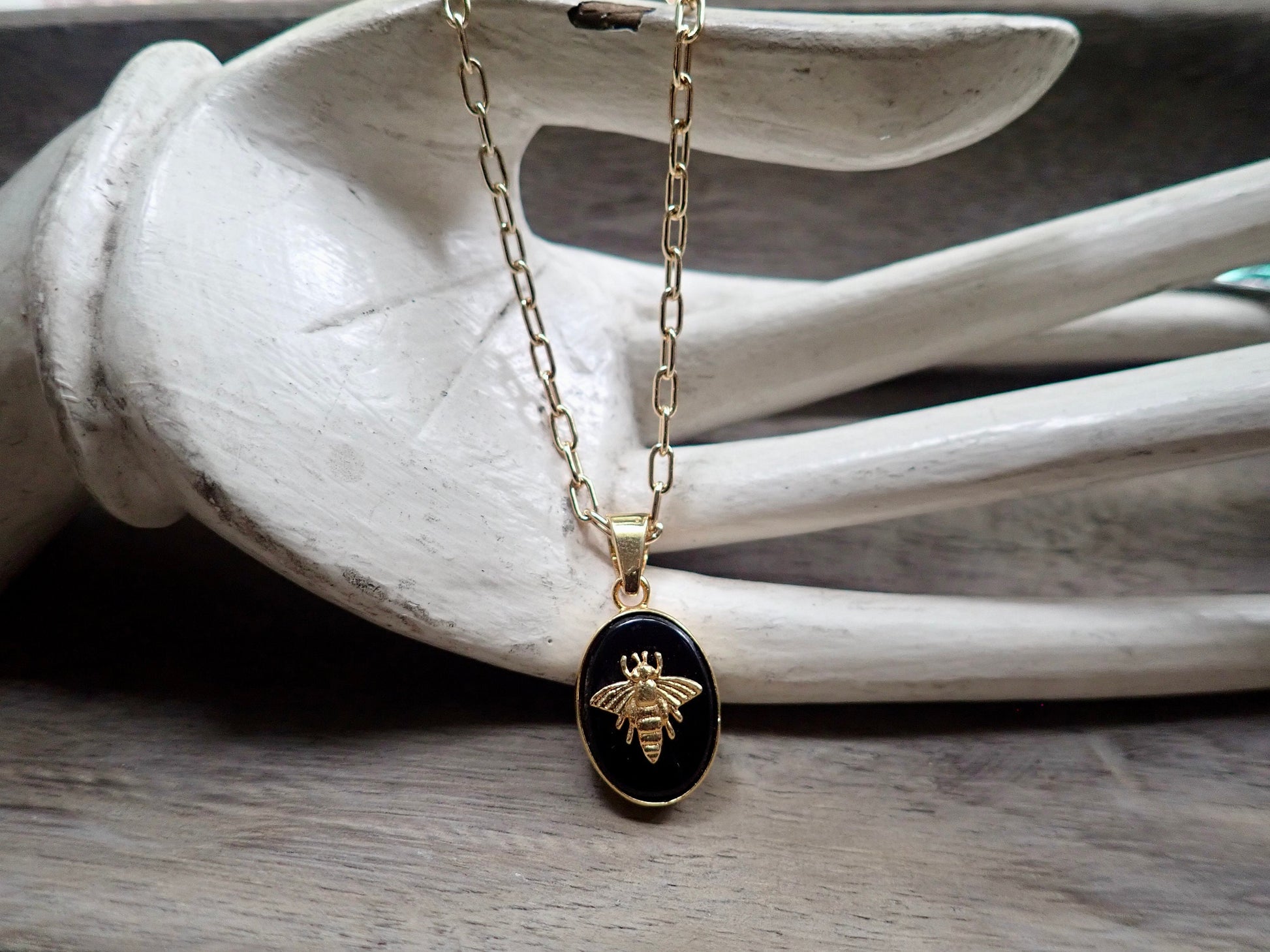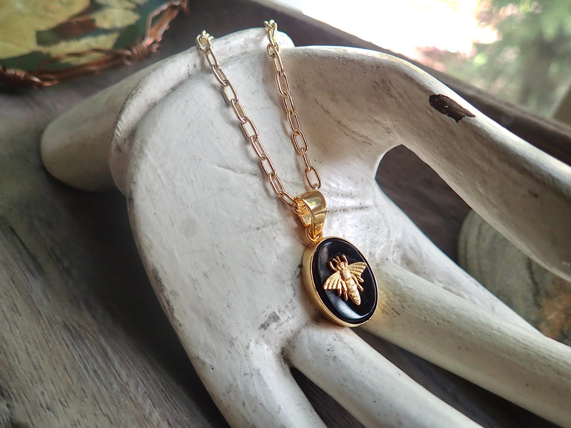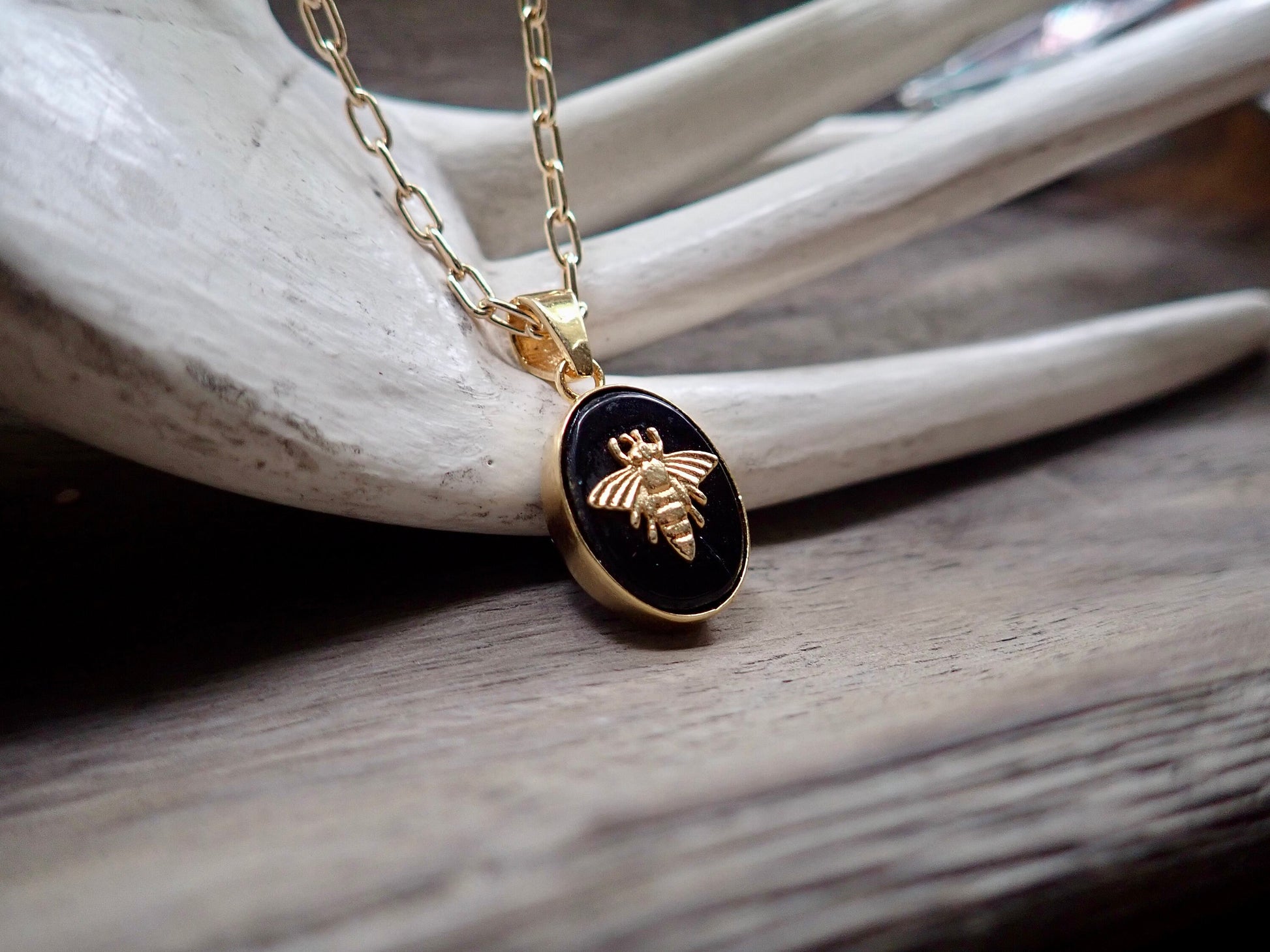 A darling little necklace featuring a charming and intricate gold honey bee and black onyx. The perfect gift for someone you love and full of special meaning. The bee, as a totem animal, are for those whose greatest wish is for all living things to co-exist in peace and harmony. In Egypt, the bee was a symbol of royalty and power. This comes from the legend that the bee was born from the tears of Ra, In Renaissance times, the bee was a symbol of love and associated with Cupid