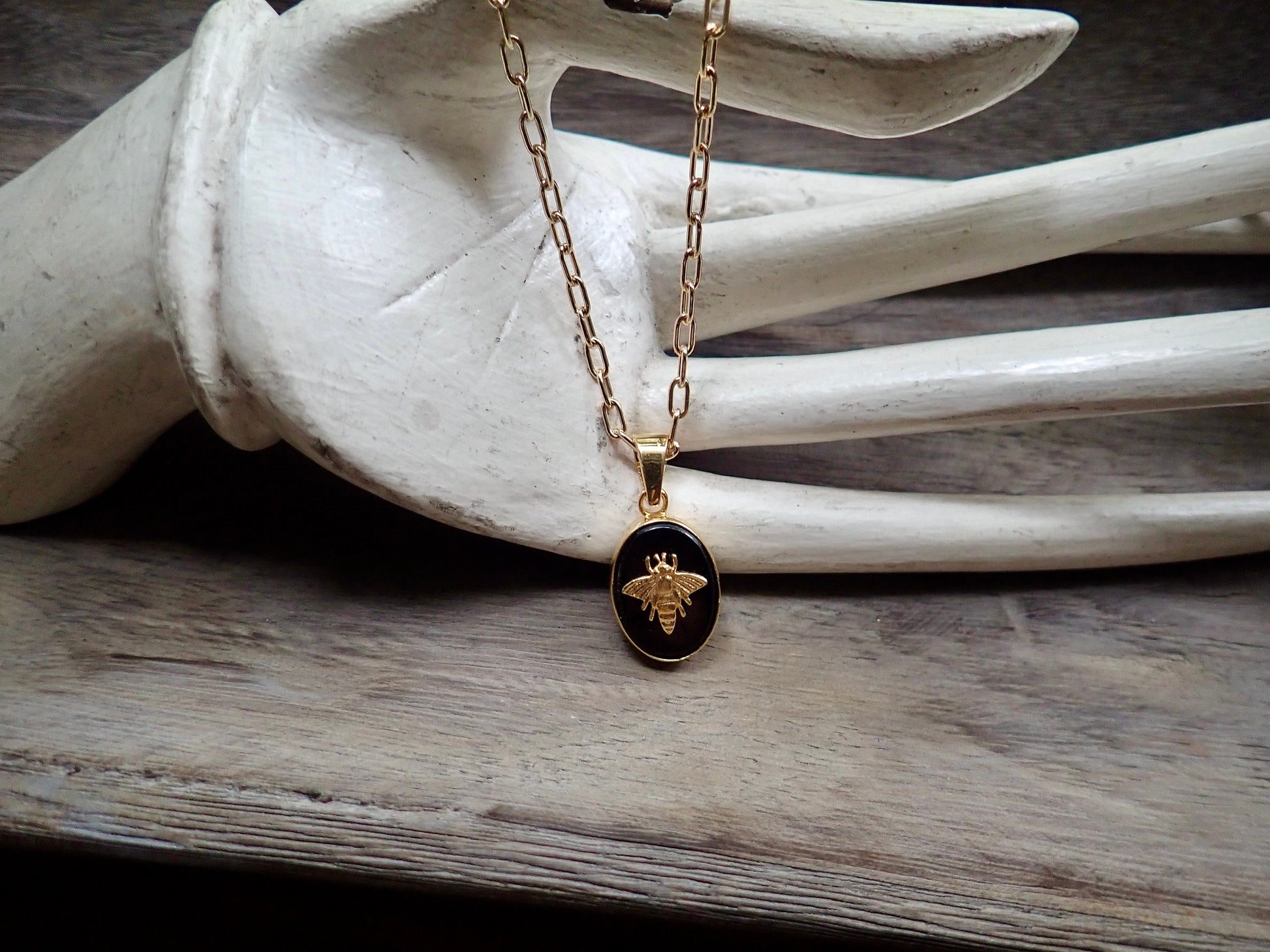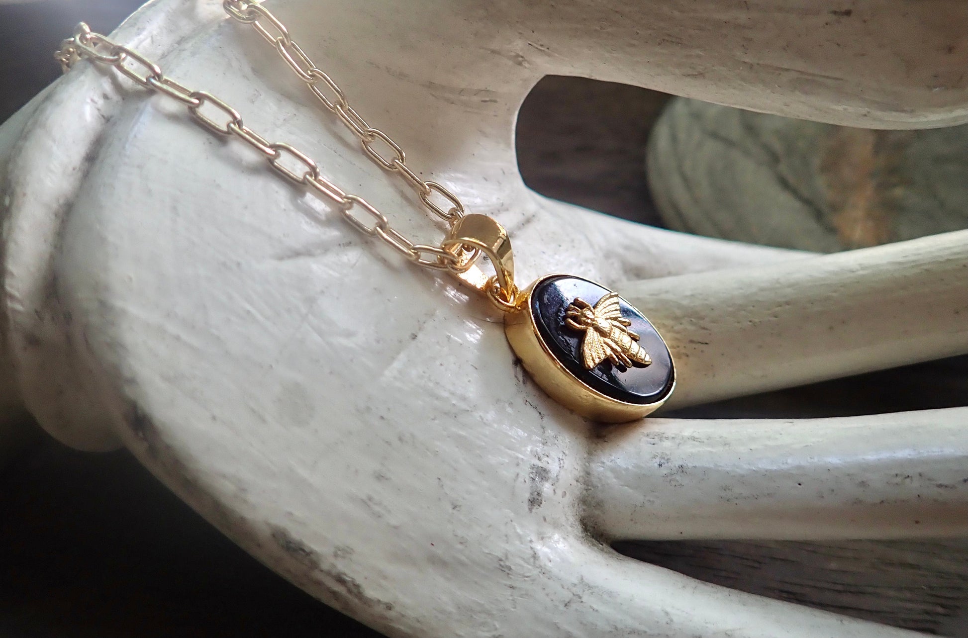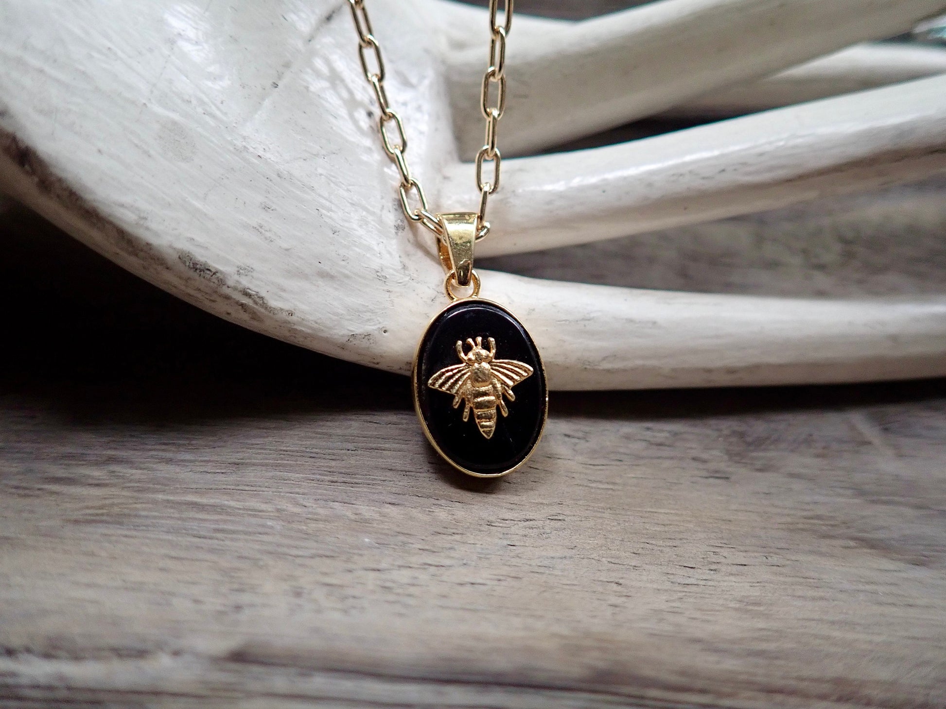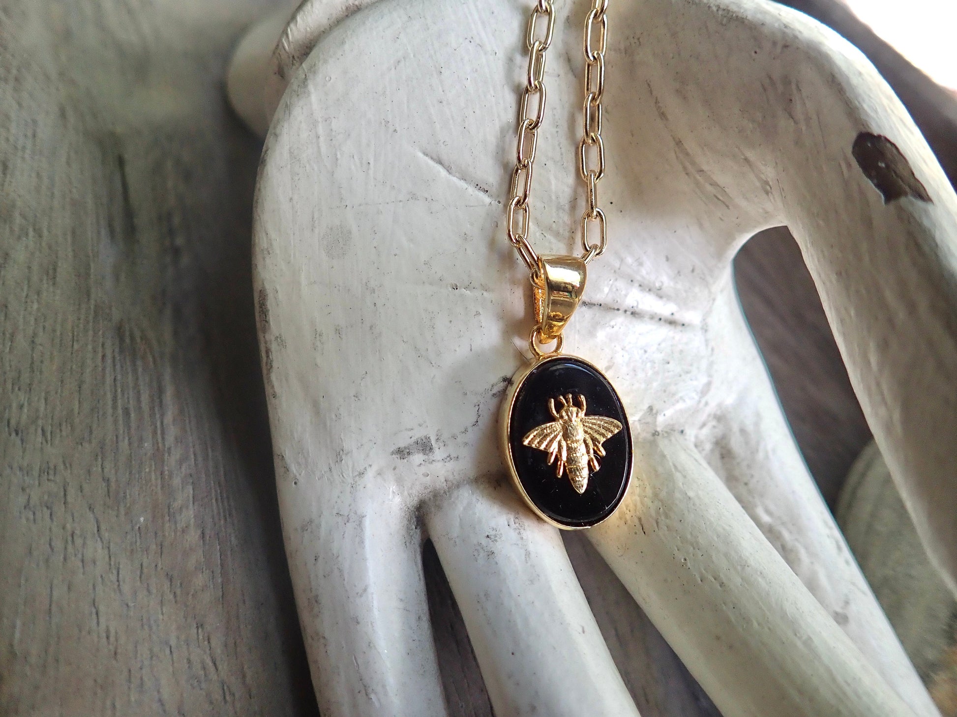 A darling little necklace featuring a charming and intricate gold honey bee and black onyx. The perfect gift for someone you love and full of special meaning. The bee, as a totem animal, are for those whose greatest wish is for all living things to co-exist in peace and harmony. In Egypt, the bee was a symbol of royalty and power. This comes from the legend that the bee was born from the tears of Ra, In Renaissance times, the bee was a symbol of love and associated with Cupid