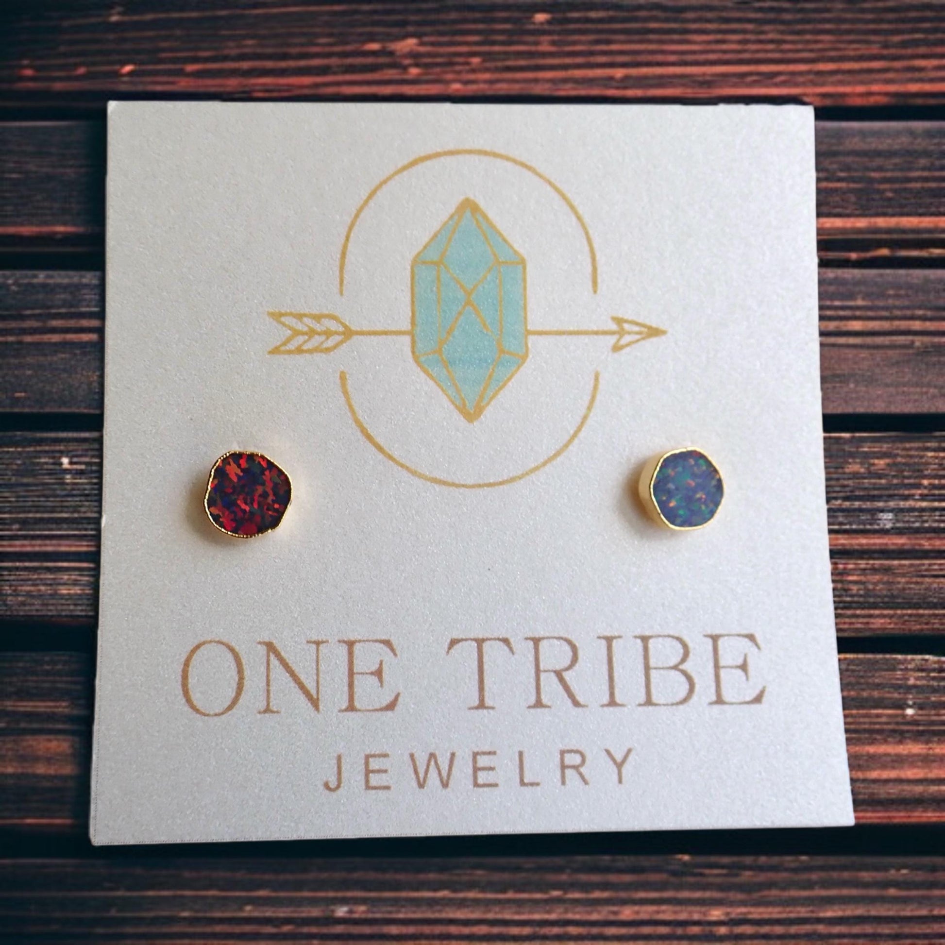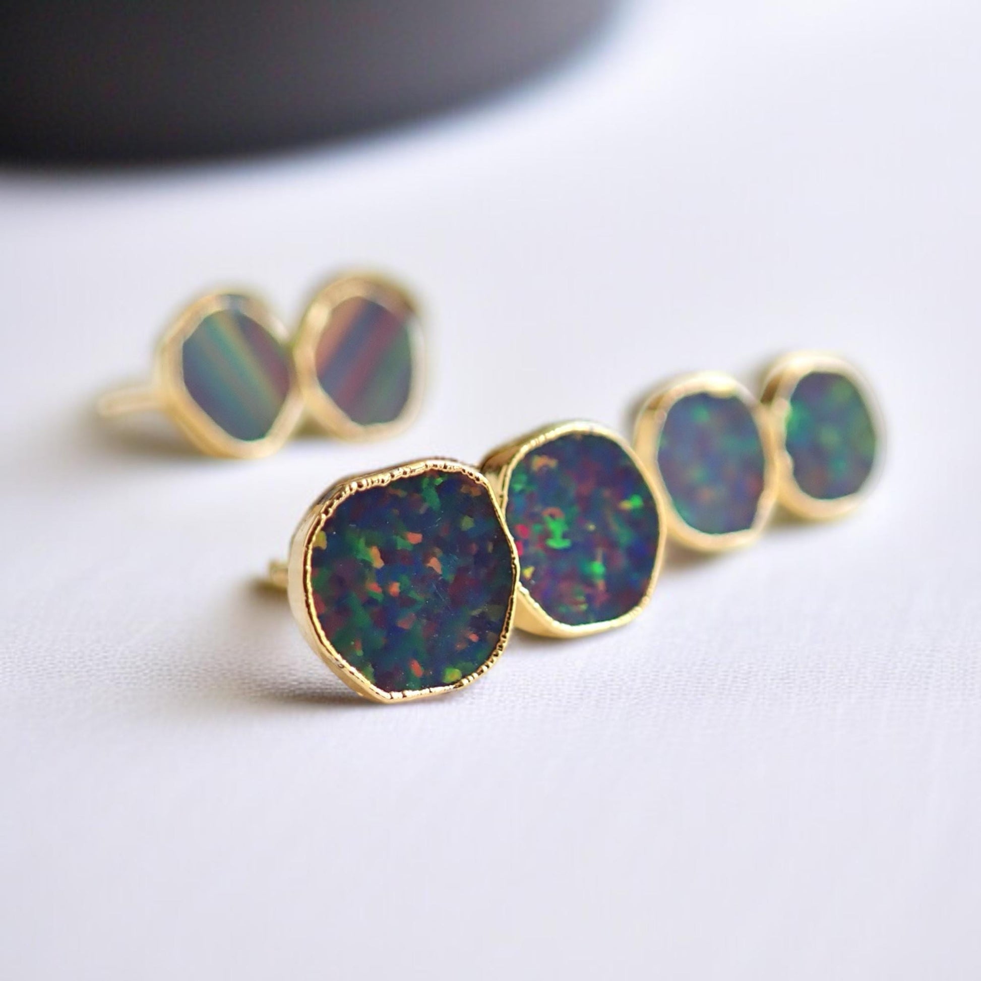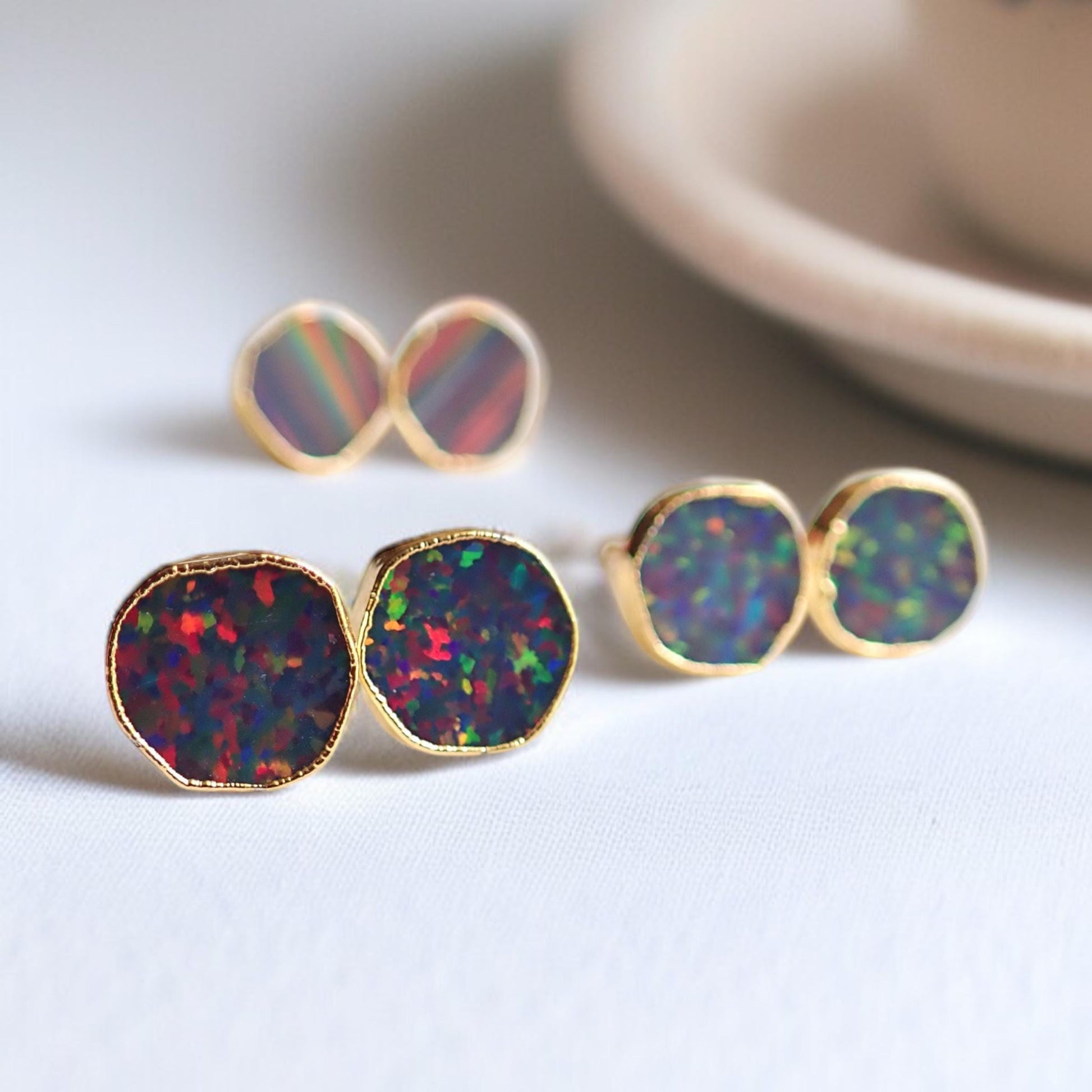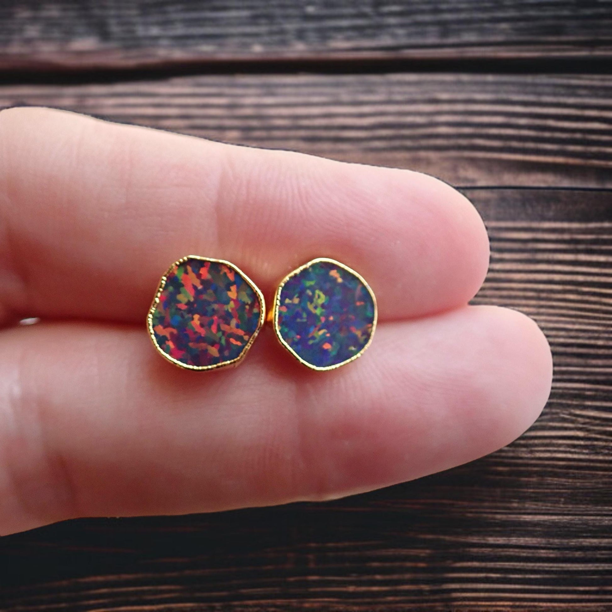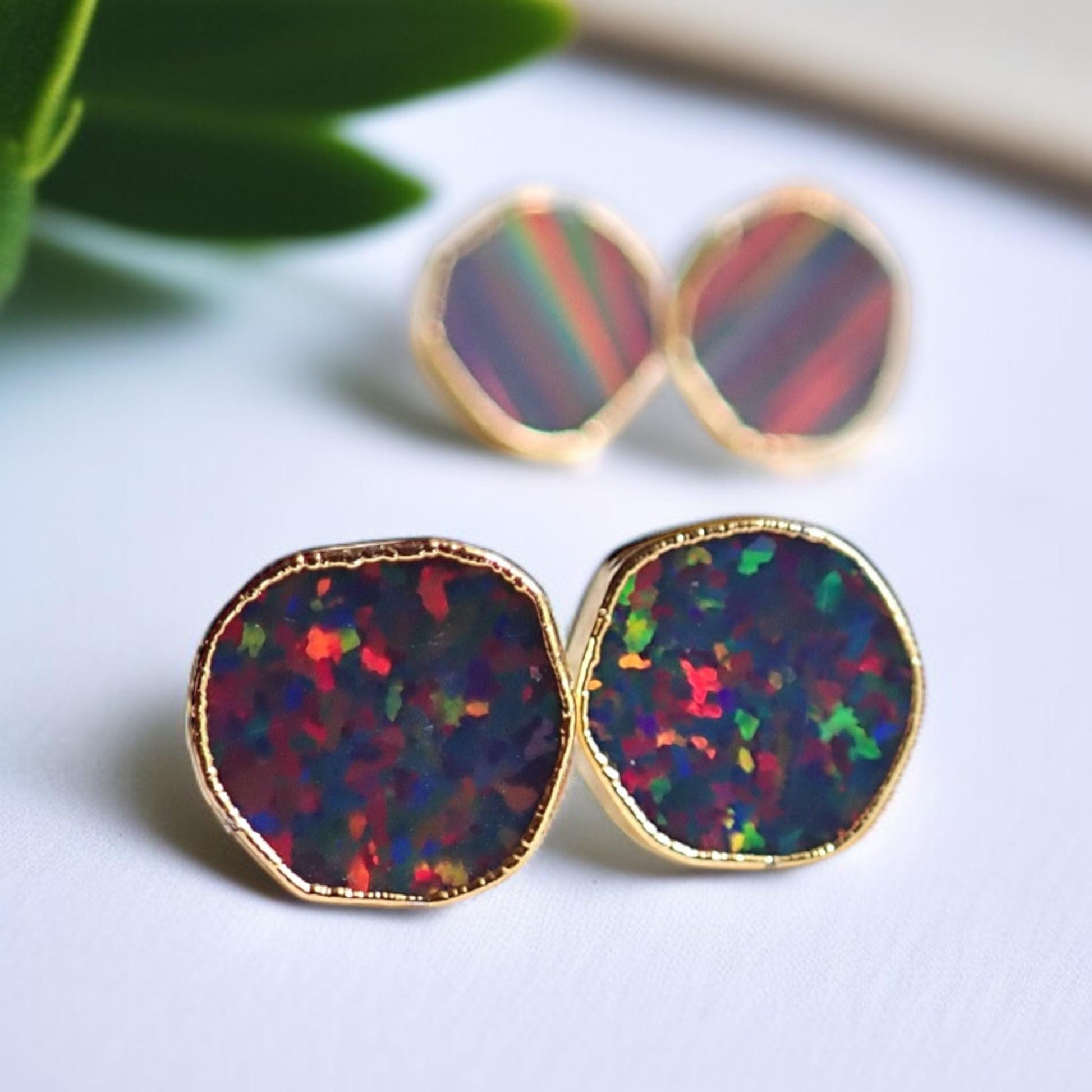These striking opals are hand-cut to your selected pattern, then expertly bezel-set in a thick 14k gold electroplated setting. Each pair is lightweight, comfortable, and ready to elevate any outfit.