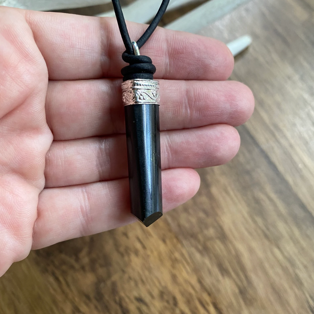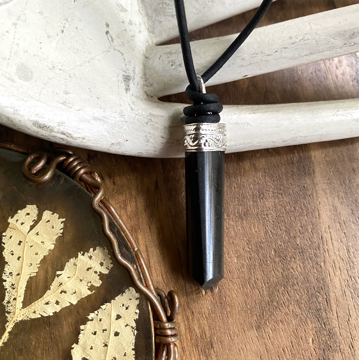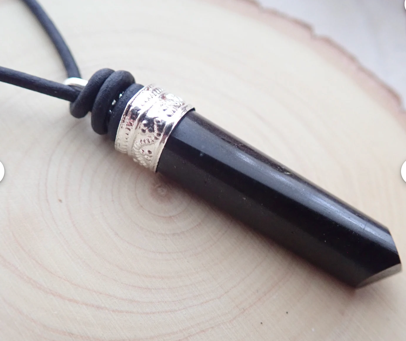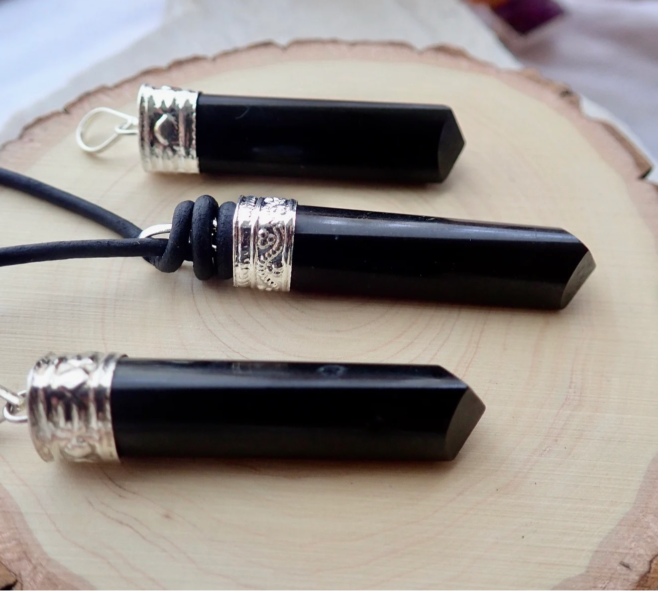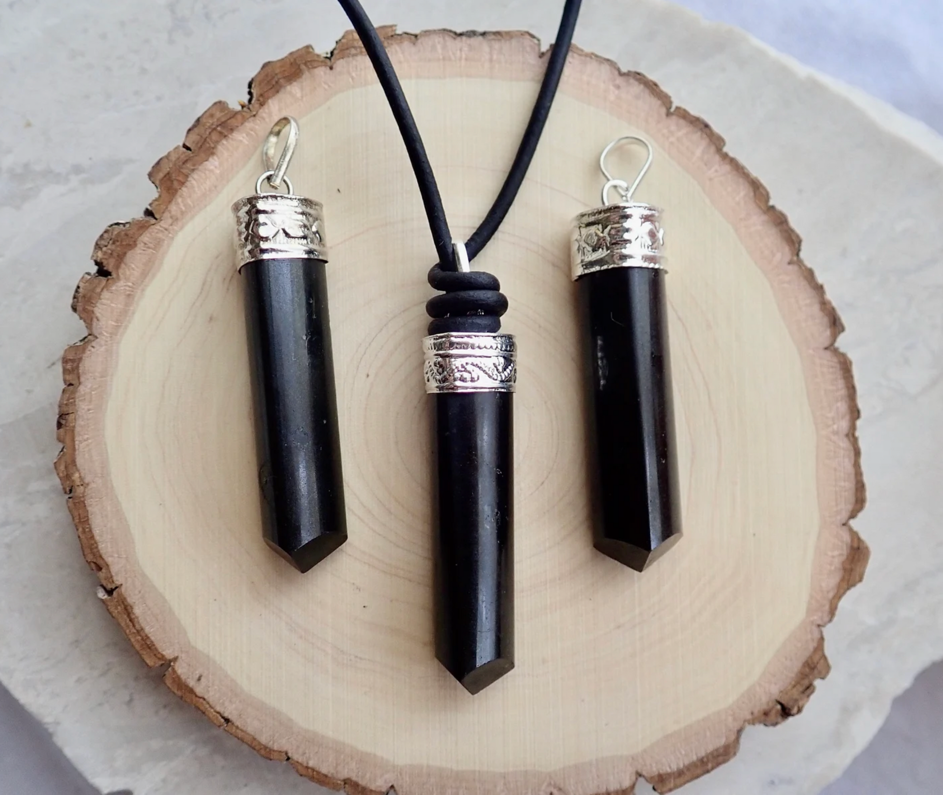 The perfect gift for the stylish man in your life. These natural, black tourmaline crystals are each unique and hang from soft black leather cord. Double slip knots make the length quite adjustable. The top of each tourmaline is capped with a sterling silver cap and bail.