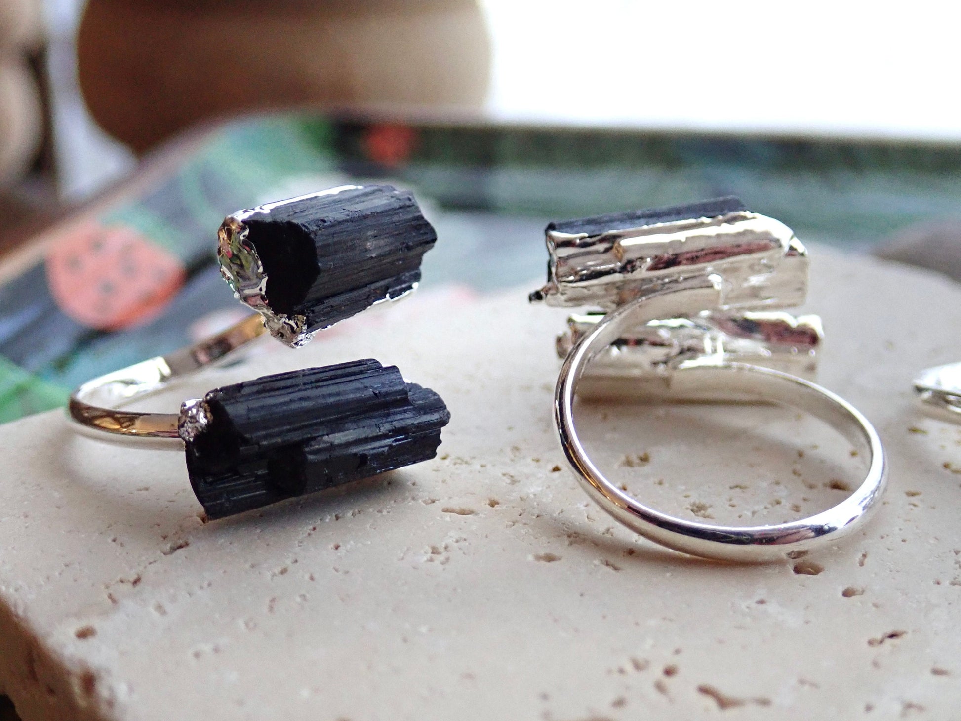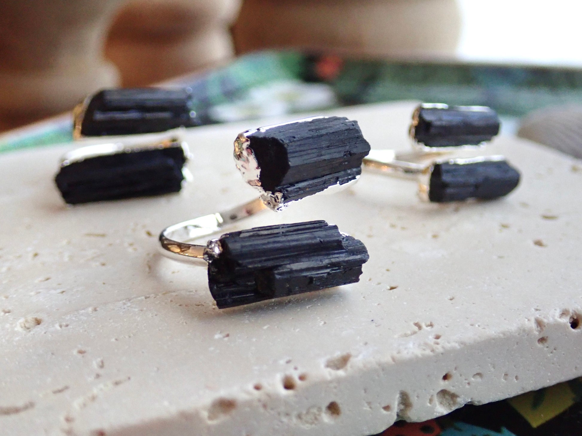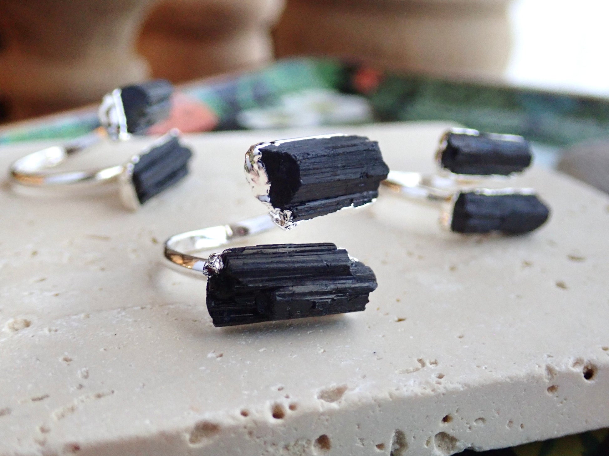 Make a statement with these gorgeous and adjustable raw gemstone rings. Dainty, raw black tourmaline stones are plated in silver.