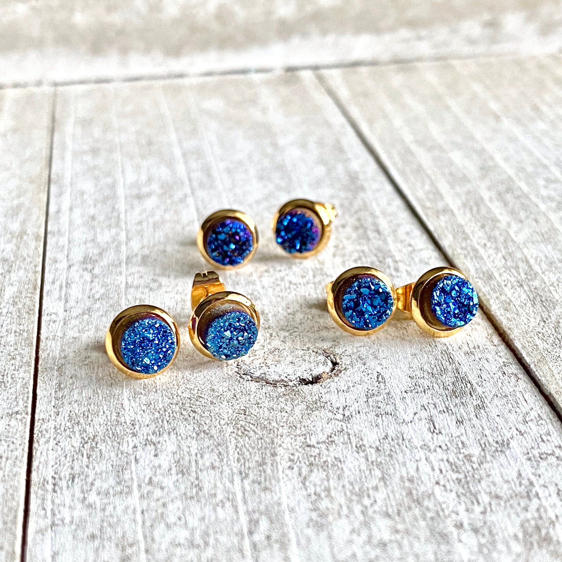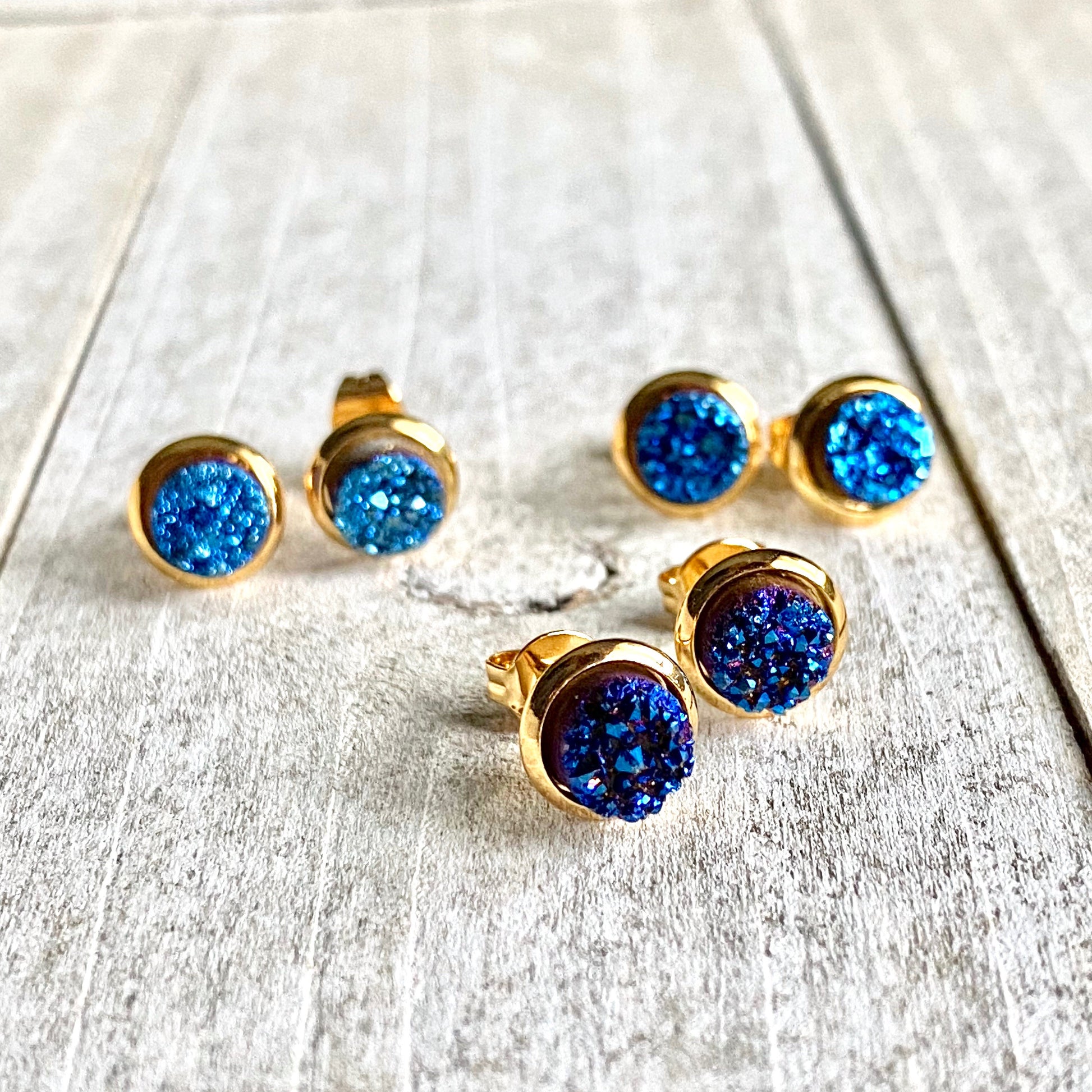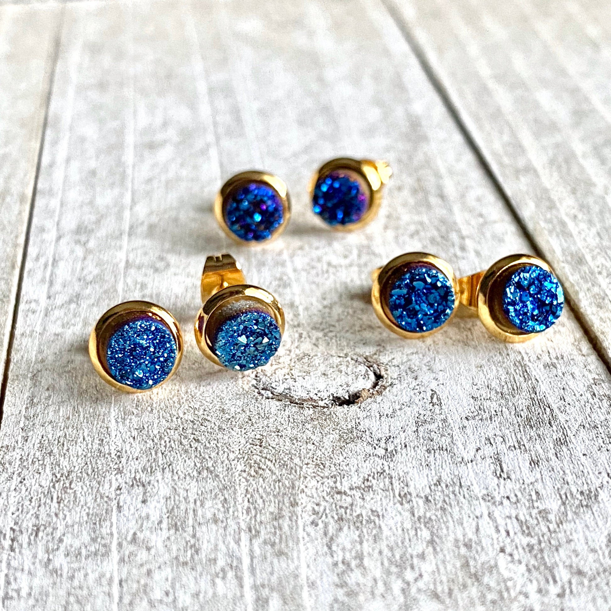 Everyday earrings that pack a punch. Who doesn't love a little sparkle? With these dainty little beauties you can wear that unmistakable druzy shimmer every day of the week. Great for every day wear..super light and carefree. The natural druzy stones are coated with titanium and heat treated to create these sparkly darlings. Gold plated bezel and posts.