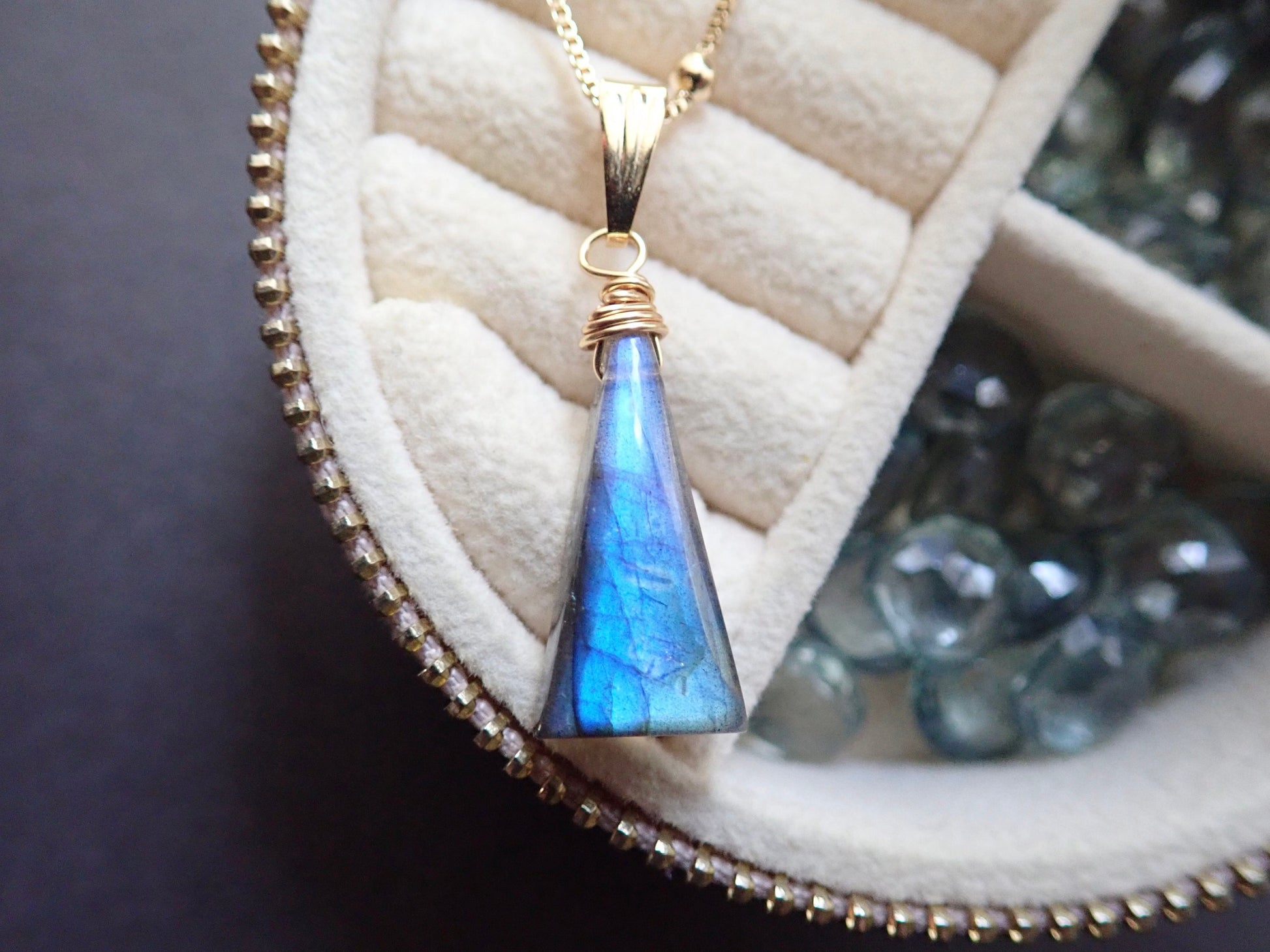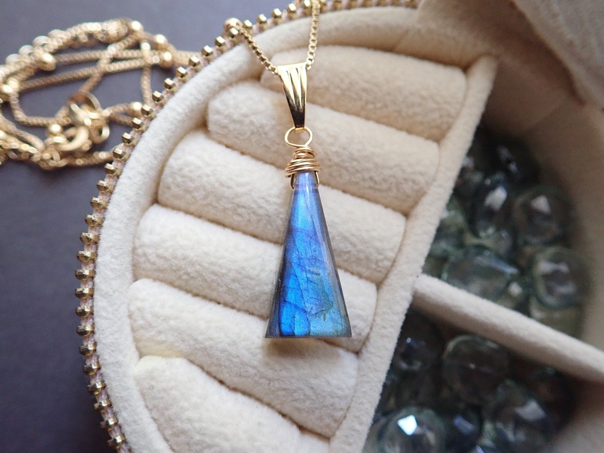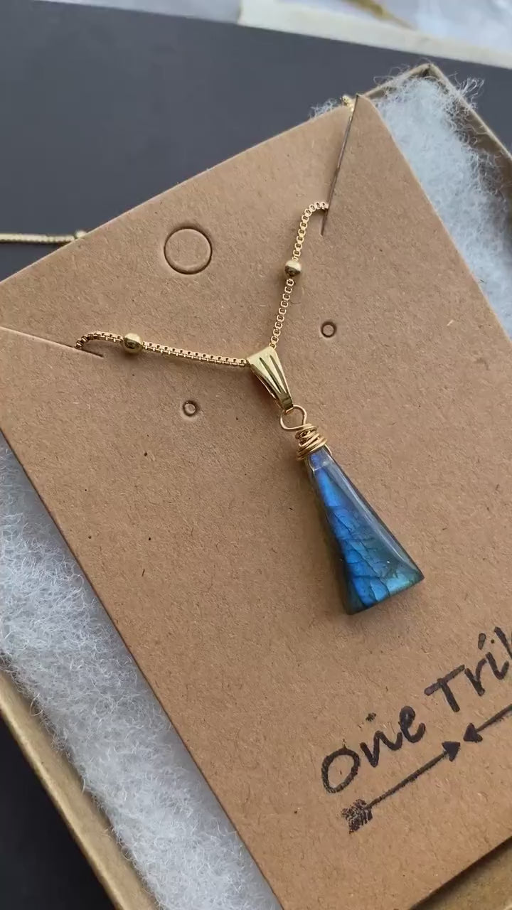 An absolutely gorgeous blue flash labradorite crystal is cut and polished smooth into long triangle and hung from a high quality 18k gold fill satellite chain. These stones are truly dazzling and guaranteed to have plenty of that gorgeous light shimmering labradorescence this gem is adored for. An easy, everyday gemstone necklace that will surely become a go-to piece.