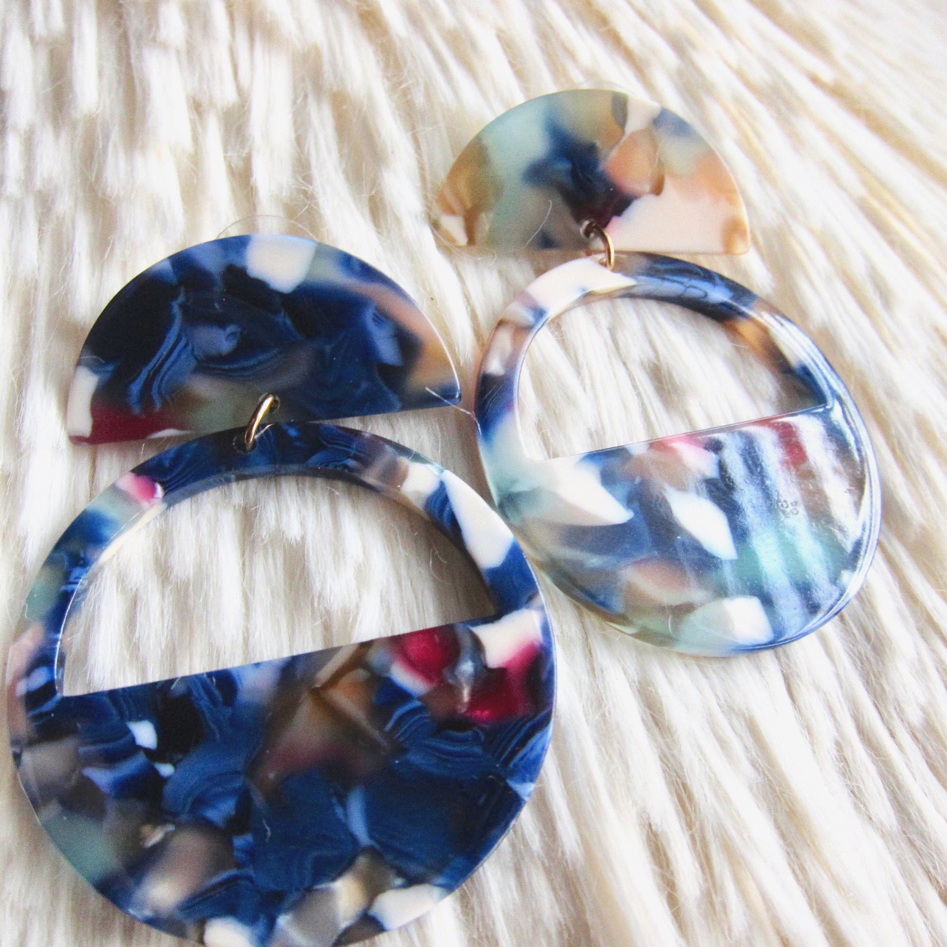 * We use high quality cellulose acetate imported from Italy. It's a much higher grade material than you'll find in a lot of other tortoise shell earrings which are made from cheap plastic that is rigid and thus prone to breaking. This material is super strong and pliable so it has a lot of give...it bends not breaks. You can feel good about wearing these too as the acetate is a vegan plastic that is natural and sustainable. This material is super lightweight but still durable and strong.